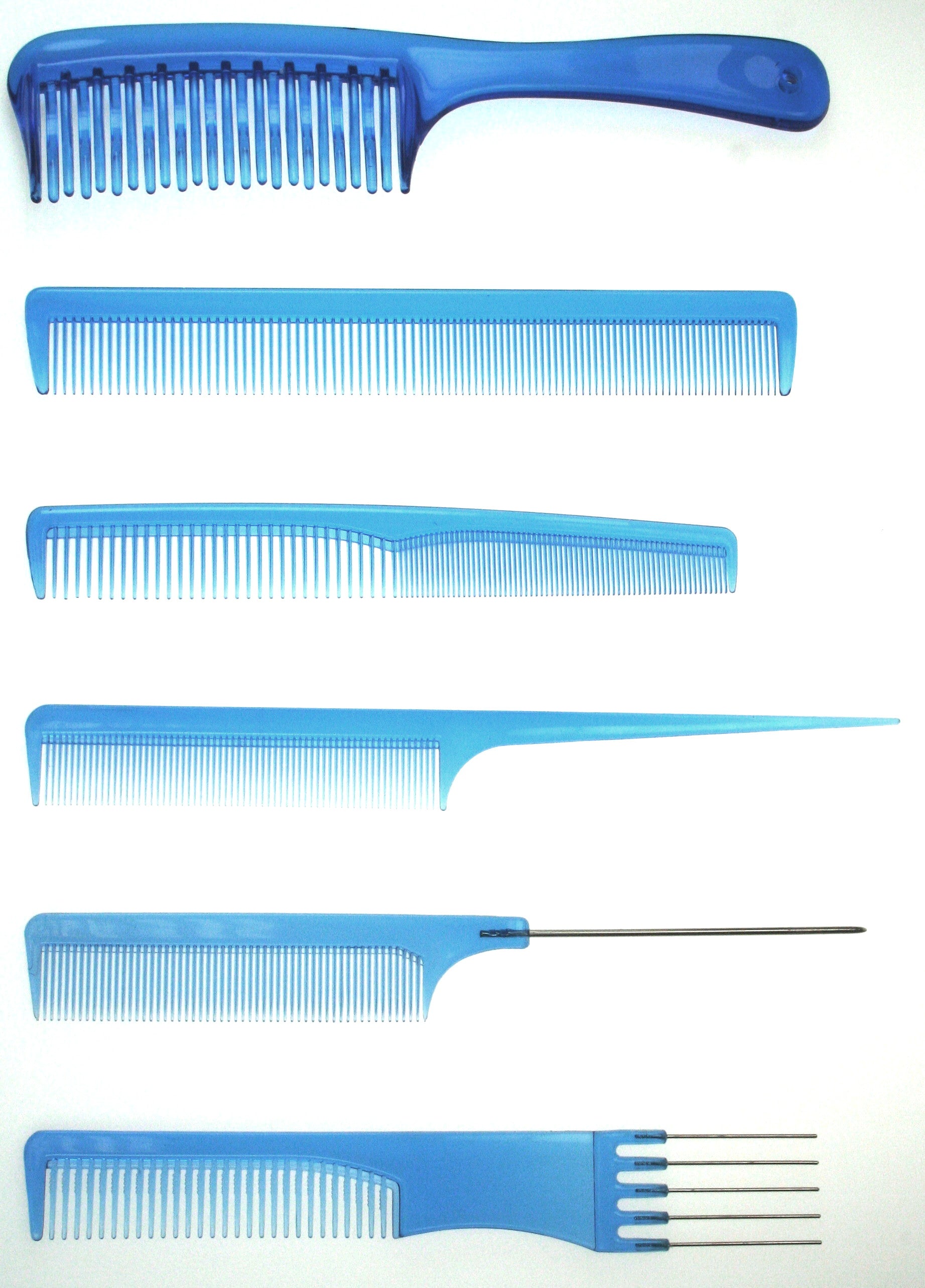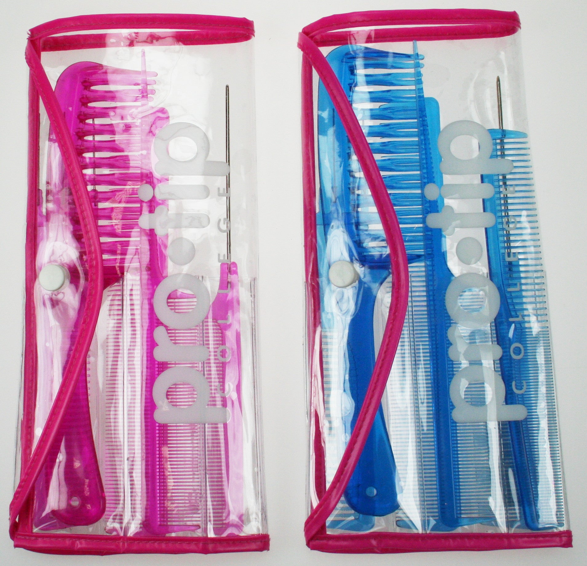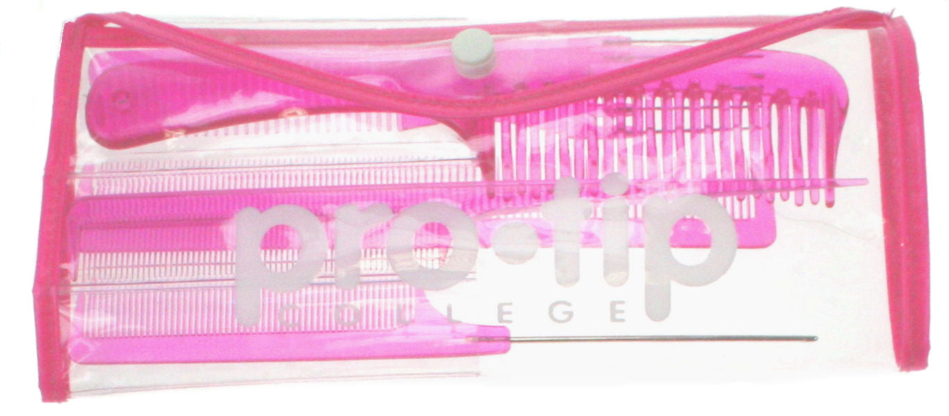 Pro-Tip College Hair Comb Kit come in a excellent clear comb wallet for college students and professionals alike. Pro-Tip professional combs are made from superior grade delrin plastic and hand finished to enhance performance at the highest level. This comb set contains: 1 x metal prong lifter, 1 x metal pin tail comb, 1 x tail comb, 1 x cutting comb, 1 x military cutting comb. Available in clear blue colour wallet packet.