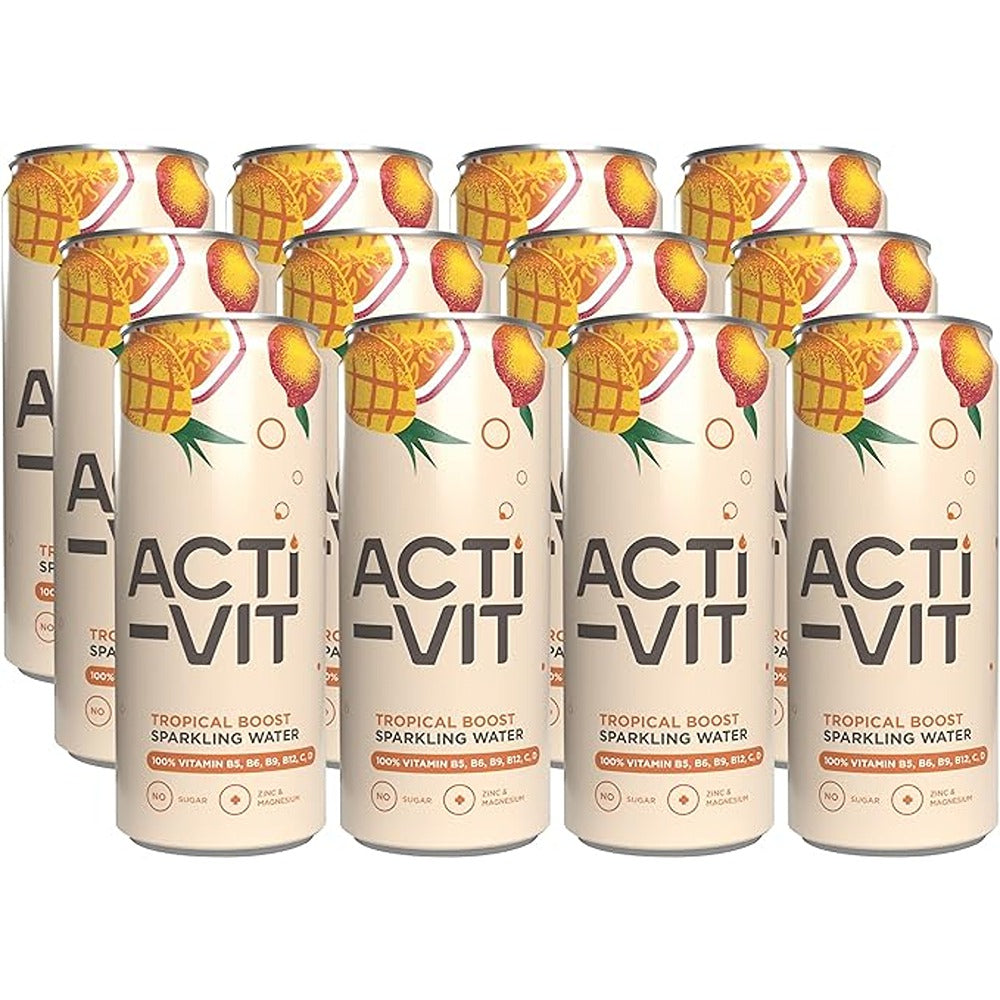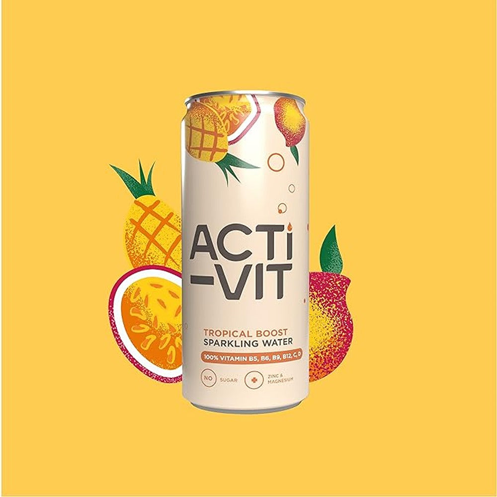 Acti-Vit is a gobsmackingly delicious sparkling, flavoured vitamin water, enriched with 8 key vitamins and minerals!Every can contains 100% of your RDA of Vitamins B5, B6, B9, B12, C, D and Zinc, as well as a healthy splash (15% RDA) of Magnesium, helping to: