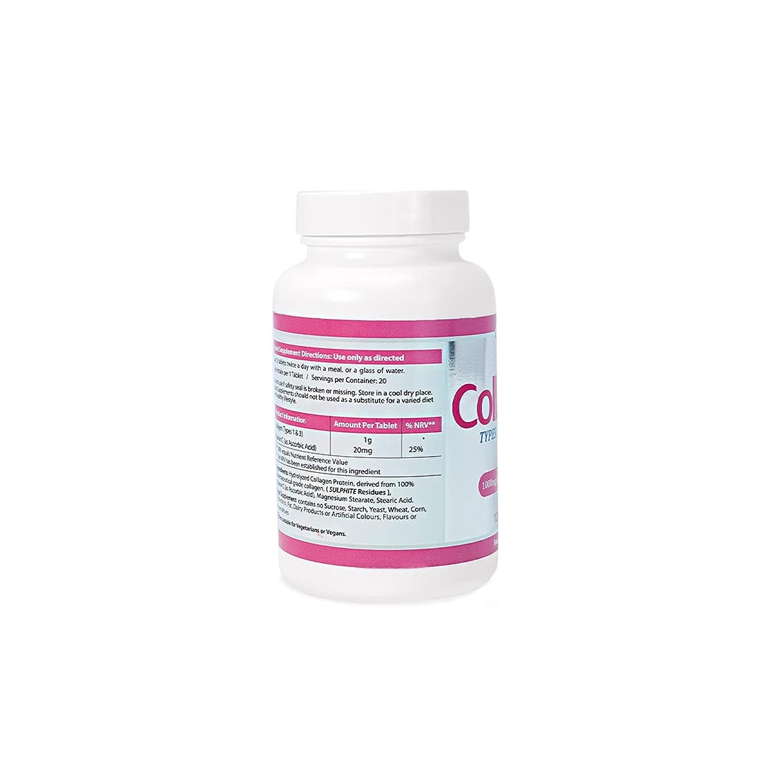 IngredientsHydrolyzed Collagen Protein, derived from 100% pharmaceutical grade collagen, ( Sulphite Residues), Vitamin C ( as Ascorbic Acid), Magnesium Stearate, Stearic Acid