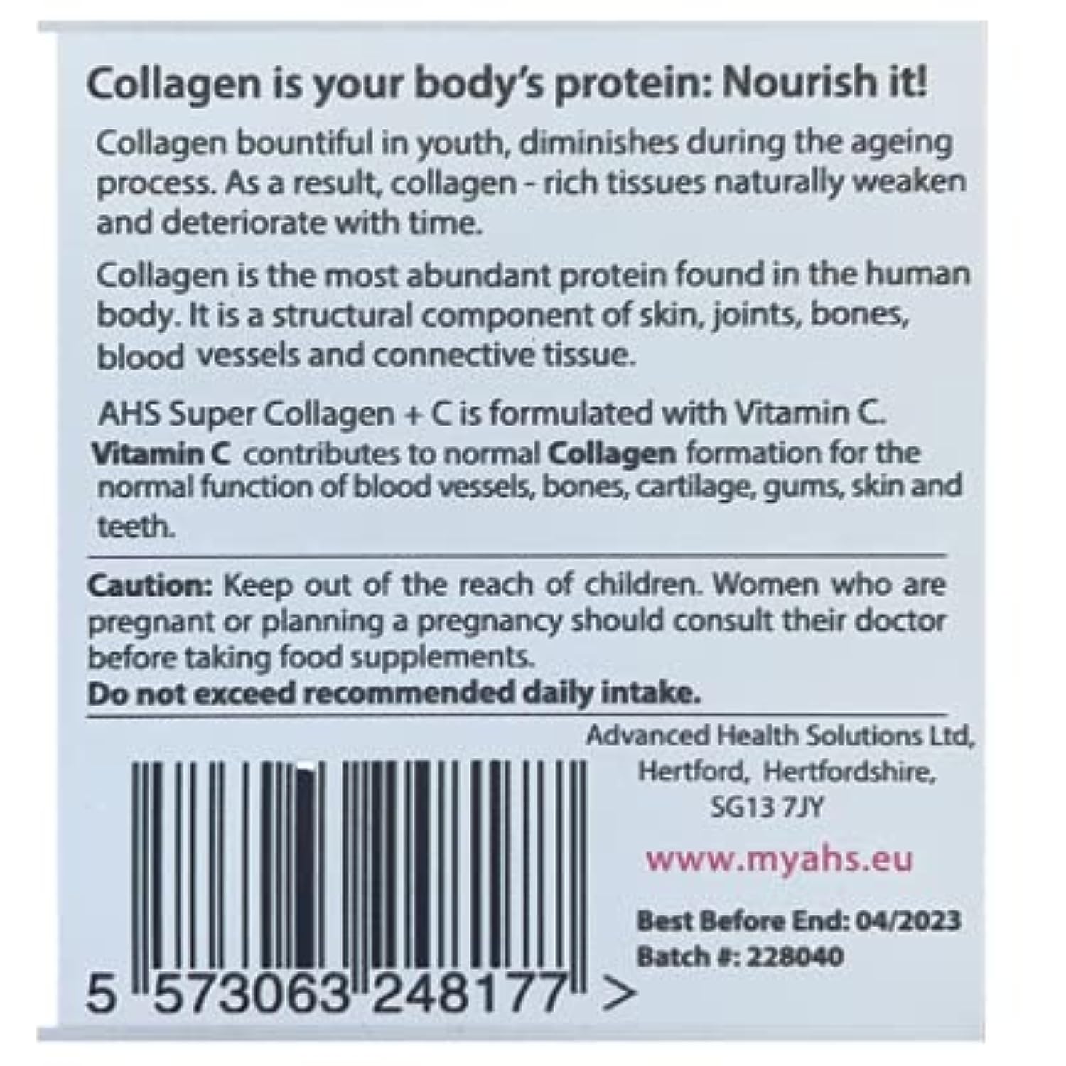 The main reason for the formation of fine lines, wrinkles and the appearance of ageing is the depletion of collagen in the skin. Collagen is the most abundant structural protein in the body and as we age we start to lose our natural supply. Super Collagen + C is from 100% pure pharmaceutical collagen which works skin deep and may combat this loss to plump up the skin and reduce the appearance of fine lines. Collagen has been scientifically proven to improve nail and hair health and users report their nails become less brittle and their hair glossier and thicker. This exclusive system contains a pharmaceutical grade supplement formula. When used as directed it may help in the reduction of frown lines, crow’s feet and nasal labial lines as it can help stimulate natural collagen production. Other benefits include the promotion of elasticity in connective tissue, blood vessels to improve circulation and a glowing complexion. This helps start the whole process of progressive regeneration. Active ingredients per tablet: Collagen Protein Types 1&3 1000mg, Vitamin C (as calcium ascorbate) 10mg, Magnesium Stearate as an anti caking agent. Take three tablets twice a day with a meal or glass of water. Use only as directed Keep out of the reach of children. Women who are pregnant or planning a pregnancy should consult their doctor before taking dietary supplements. Food Supplements should not be used as a substitute for a varied diet and a healthy lifestyle. Do not exceed the recommended daily intake. Store in a cool dry place. Do not use if safety seal is broken or missing. Collagen is not suitable for vegetarians or vegans. Allergen Advice may contain Sulphute Residues.