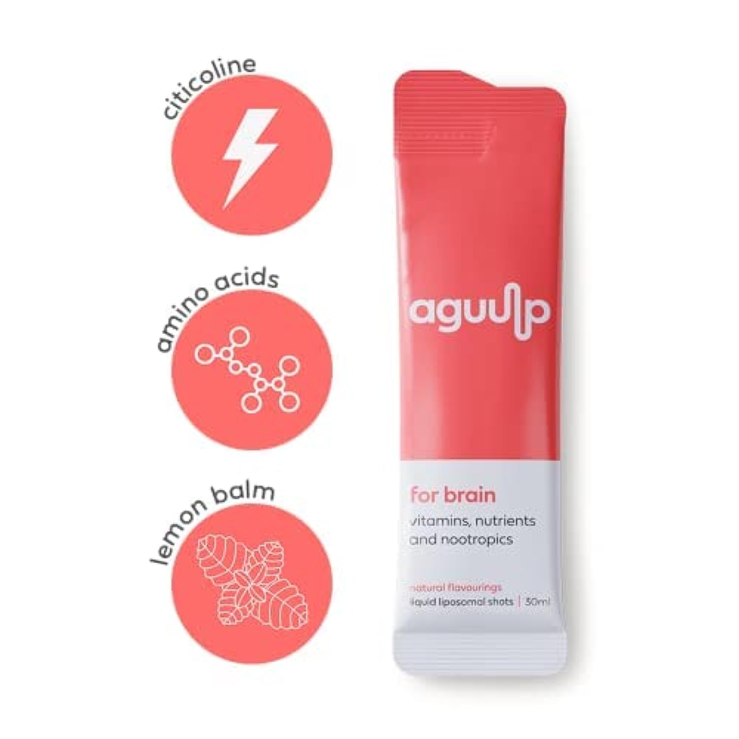 With Aguulp for Brain, you can expect sharper focus and clarity; increased energy and motivation; and improved mood with just one sachet. Using patented liquid liposomal technology for targeted delivery, (think waterproof onesies, for nutrients) Aguulp formulas offer up to 98% absorption. Comprehensive and convenient, at home or on the go, the nutrients you need in just one gulp. The key ingredients: Citicoline The naturally occurring compound Citicoline, plays a crucial role for our Brain. This nootropic agent can help keep your memory sharp, enhance focus and attention and all-round cognitive abilities. It does this by helping to protect the brain from damage through ageing, while also increasing the level of crucial neurotransmitters and increasing mental energy. Amino Acids (Acetyl L-Carnitine, L-Theanine, L- Tyrosine) We have three key Amino Acids in Aguulp for Brain, Acetyl L-Carnitine, L-Theanine & L-Tyrosine. Acetyl L-Carnitine is involved in energy production and has also been shown to reduce the symptoms of type 2 diabetes. L-Theanine, found in green tea, may help relieve stress by influencing your levels of chemicals, like serotonin and dopamine. It can also contribute to increased cognitive performance and deeper sleep. Last but not least, L-Tyrosine is essential for producing dopamine, norepinephrine and adrenaline. Lemon Balm Extract (Melissa Officinalis) Derived from the lemon balm plant, lemon balm extract has been shown to have a calming effect when under mental stress. It can be used to help reduce symptoms of anxiety and improve mood. It can also help improve cognitive health by increasing levels of concentration and focus.