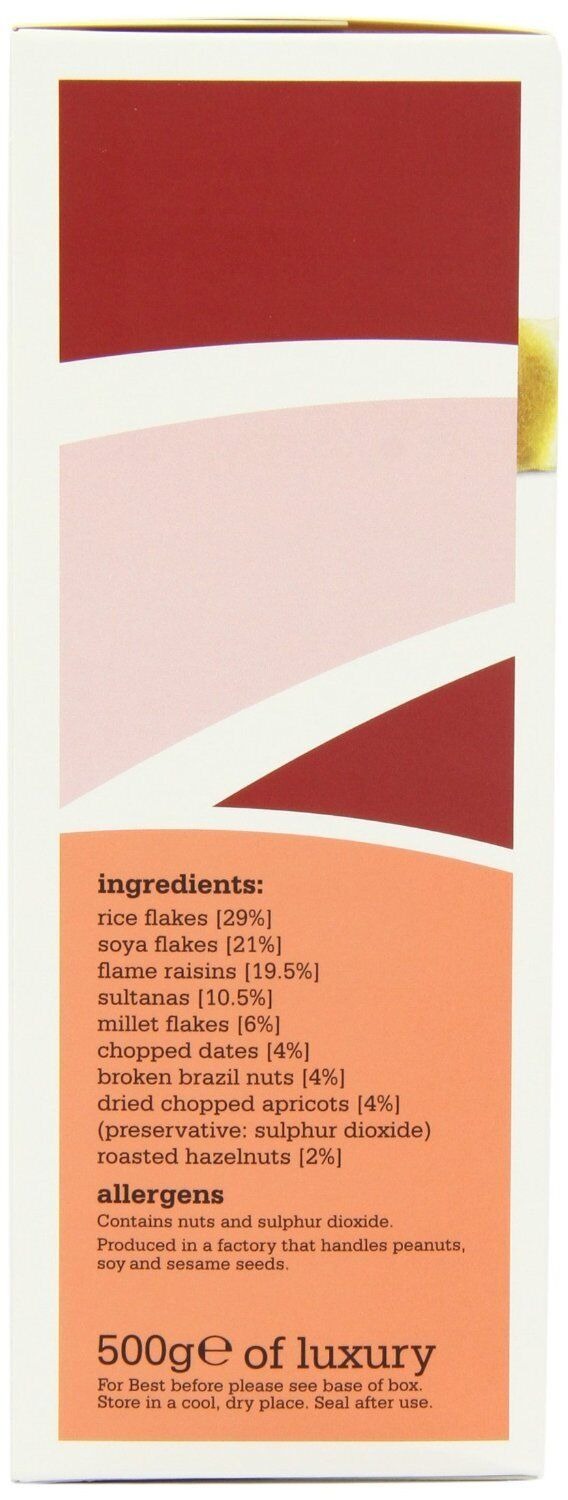 IngredientsWholegrain Rice Flakes (24.5%), SOYA Flakes (20.5%), Sultanas (16.5%), Flame Raisins (13%), Wholegrain Millet Flakes (8%), Chopped Dates (6.5%), Sunflower Seeds (4%), Chopped Apricots (4%), Chopped BRAZIL NUTS (2%), Roasted Chopped HAZELNUTS (1%).