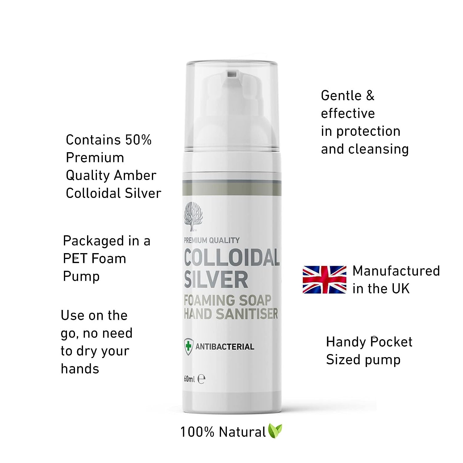 Our Colloidal Silver Foaming Handwash is totally new and all Natural. It contains a gentle, fragrance free soap blended with premium quality colloidal silver. Plenty of foam with each pump helps to cleanse and sanitise the hands thoroughly. Its gentle action will not dry or irritate the skin. It can be used without water as it is non-sticky and dries quickly giving you maximum protection whilst you are on the move!