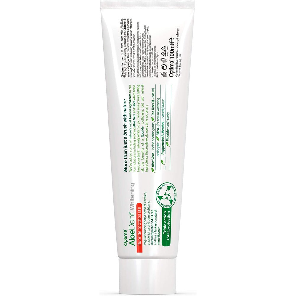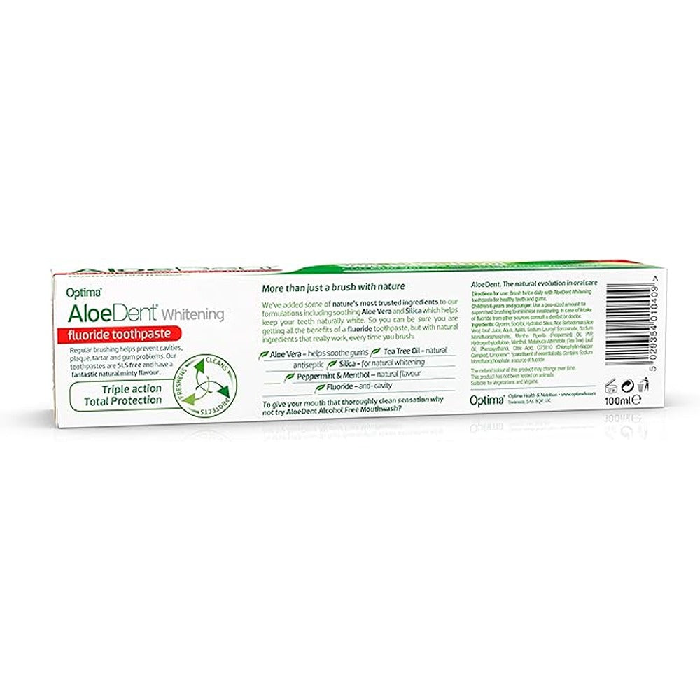 AloeDent FLUORIDE Whitening Aloe Vera Toothpaste with Silica is our whitening formulation with the addition of fluoride. Aloe Dent is a breakthrough in the science of oral hygiene. In standard toothpaste there's a percentage of water with no benefit. Aloe Dent replaced water with soothing aloe vera and combined it with a powerful blend of carefully selected natural, active ingredients to create a truly exceptional tingly fresh toothpaste...science brushed by nature.