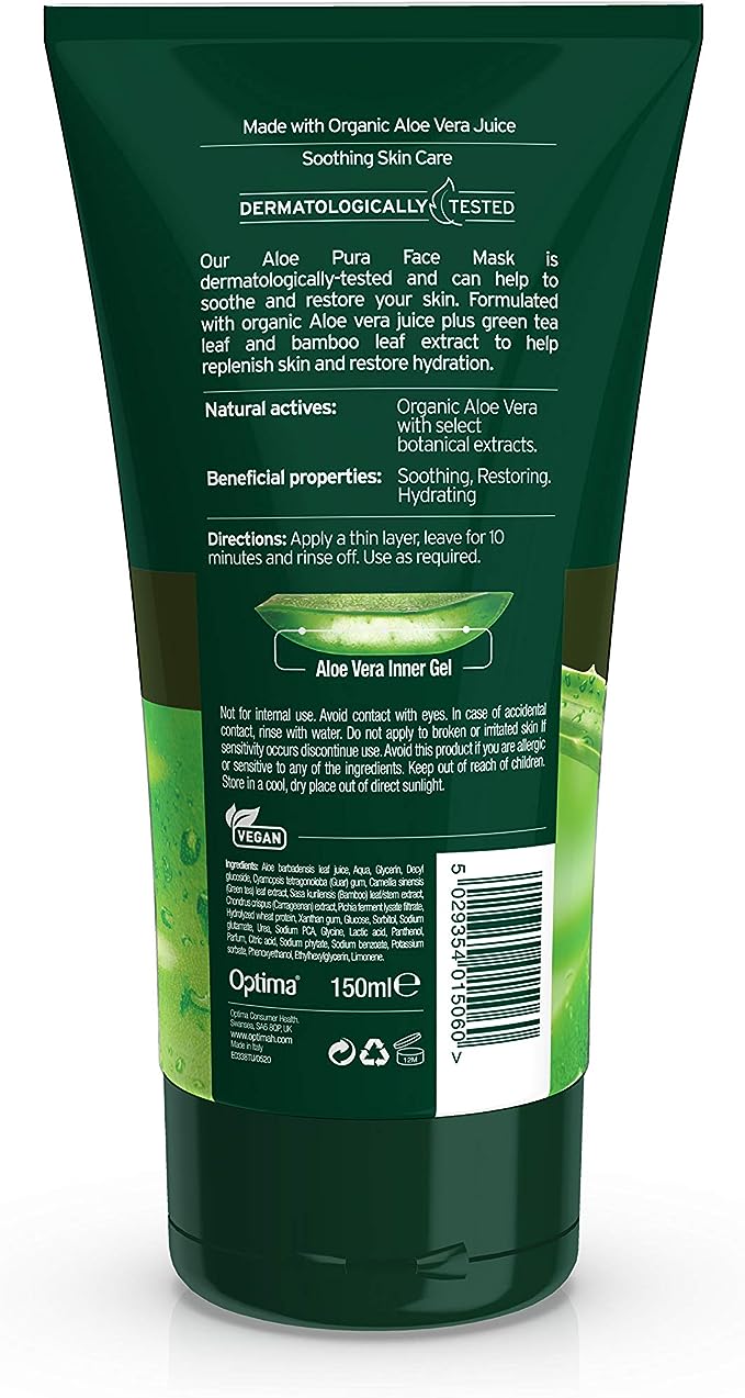 Our Aloe Pura Face Mask is dermatologically-tested and can help to soothe and restore your skin. Formulated with organic Aloe vera juice plus green tea leaf and bamboo leaf extract to help replenish skin and restore hydration. Free from Parabens and SLS, we avoid the use of synthetic ingredients. No animal testing, none of our products or raw materials are tested on animals.