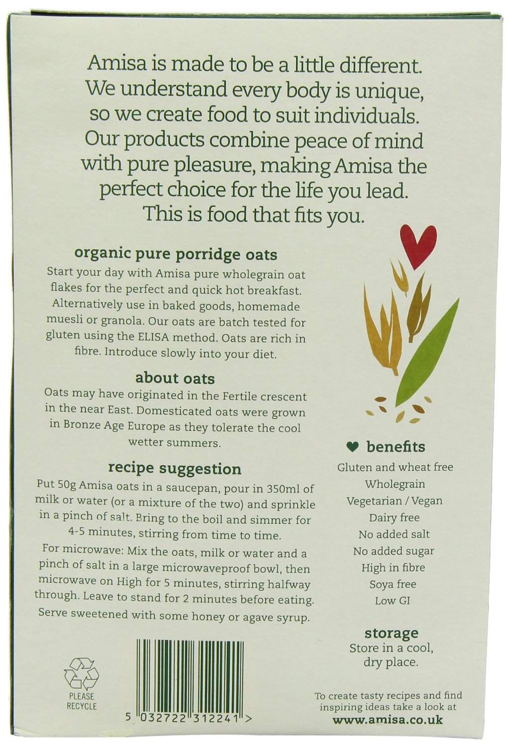 Amisa Nutritious Organic Pure Porridge Oats have certified organic ingredients. A heart-healthy way to start your day. Amisa oats are batch tested for gluten using the ELISA method and have a high soluble fibre content. It is suitable for vegan.