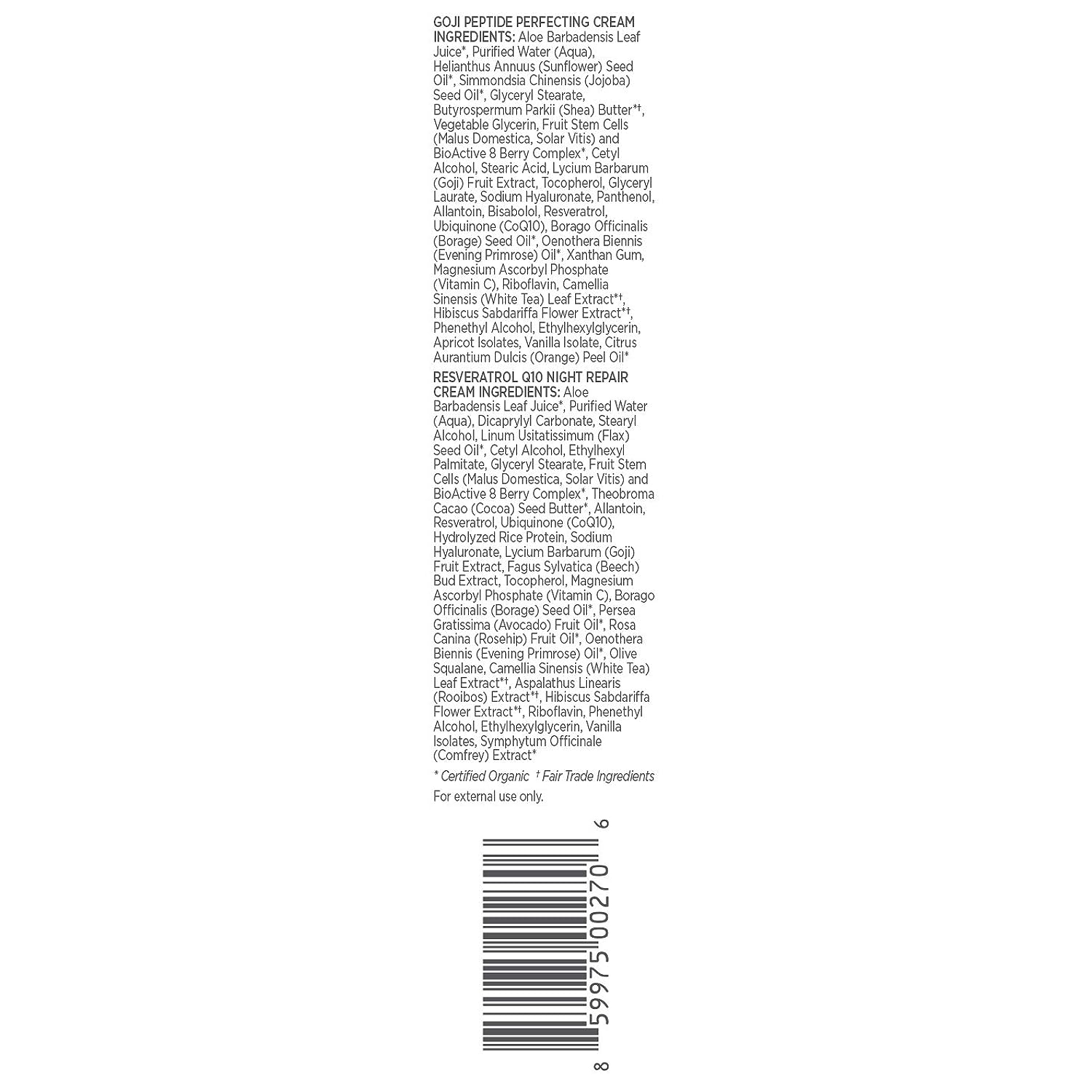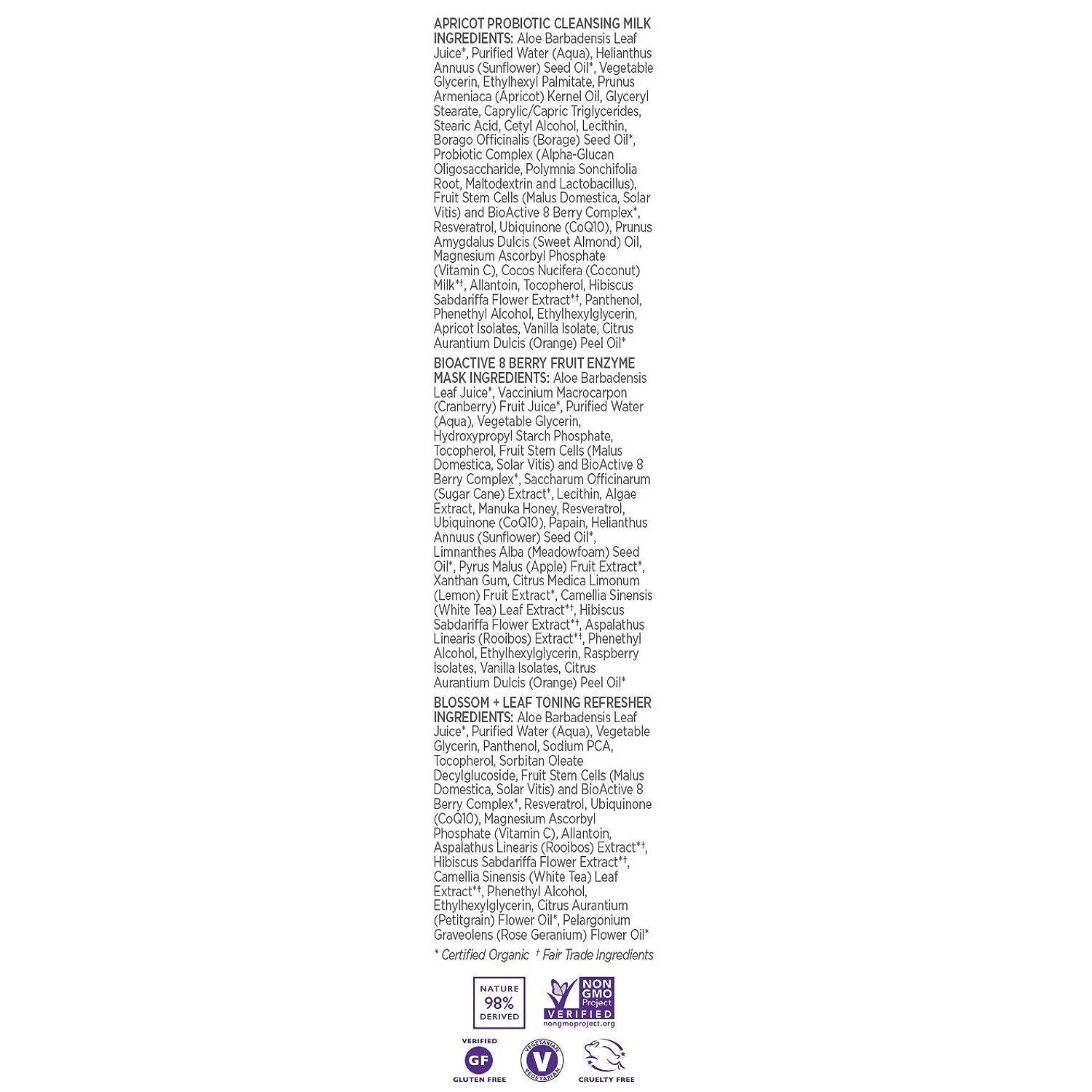 IngredientsApricot Probiotic Cleansing Milk - .8 fl oz (24 ml) Aloe barbadensis leaf juice*, purified water (aqua), helianthus annuus (sunflower) seed oil*, vegetable glycerin, ethylhexyl palmitate, prunus armeniaca (apricot) kernel oil, glyceryl stearate, caprylic/capric triglycerides, stearic acid, cetyl alcohol, lecithin, borago officinalis (borage) seed oil*, probiotic complex (alpha-glucan oligosaccharide, polymnia sonchifolia root, maltodextrin and lactobacillus), fruit stem cells (malus domestica, solar vitis) and bioactive 8 berry complex*, resveratrol,uUbiquinone (CoQ10), prunus amygdalus dulcis (sweet almond) oil, magnesium ascorbyl phosphate (vitamin C), cocos nucifera (coconut) milk*†, allantoin, tocopherol, hibiscus sabdariffa flower extract*†, panthenol, phenethyl alcohol, ethylhexylglycerin, apricot isolates, vanilla isolate, citrus aurantium dulcis (orange) peel oil* Bioactive 8 Berry Fruit Enzyme Mask - .5 fl oz (15 ml) Aloe barbadensis leaf juice*, vaccinium macrocarpon (cranberry) fruit juice*, purified water (aqua), vegetable glycerin, hydroxypropyl starch phosphate, tocopherol, fruit stem cells (malus domestica, solar vitis) and bioactive 8 berry complex*, saccharum officinarum (sugar cane) extract*, lecithin, algae extract, manuka honey, resveratrol, ubiquinone (CoQ10), papain, helianthus annuus (sunflower) seed oil*, limnanthes alba (meadowfoam) seed oil*, pyrus malus (apple) fruit extract*, xanthan gum, citrus medica limonum (lemon) fruit extract*, camellia sinensis (white tea) leaf extract*†, hibiscus sabdariffa flower extract*†, aspalathus linearis (ro