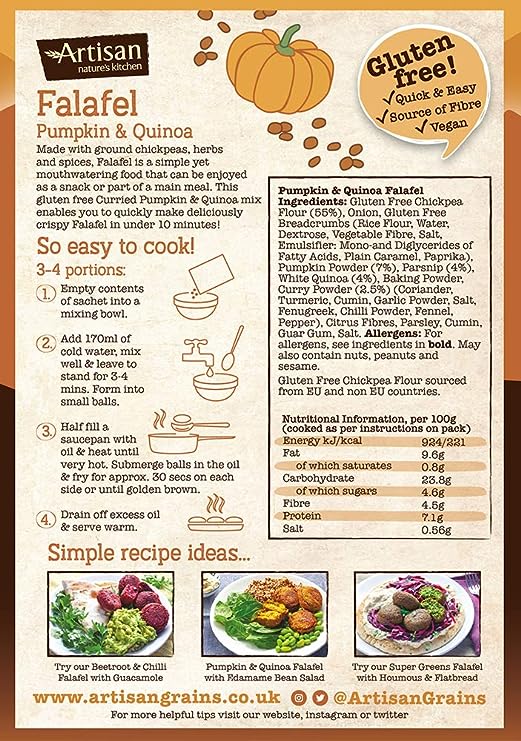 Made with ground chickpeas, herbs and spices, Falafel is a simple yet mouthwatering food that can be enjoyed as a snack or part of a main meal. This gluten free Curried Pumpkin & Quinoa mix enables you to quickly make deliciously crispy Falafel in under 10 minutes!