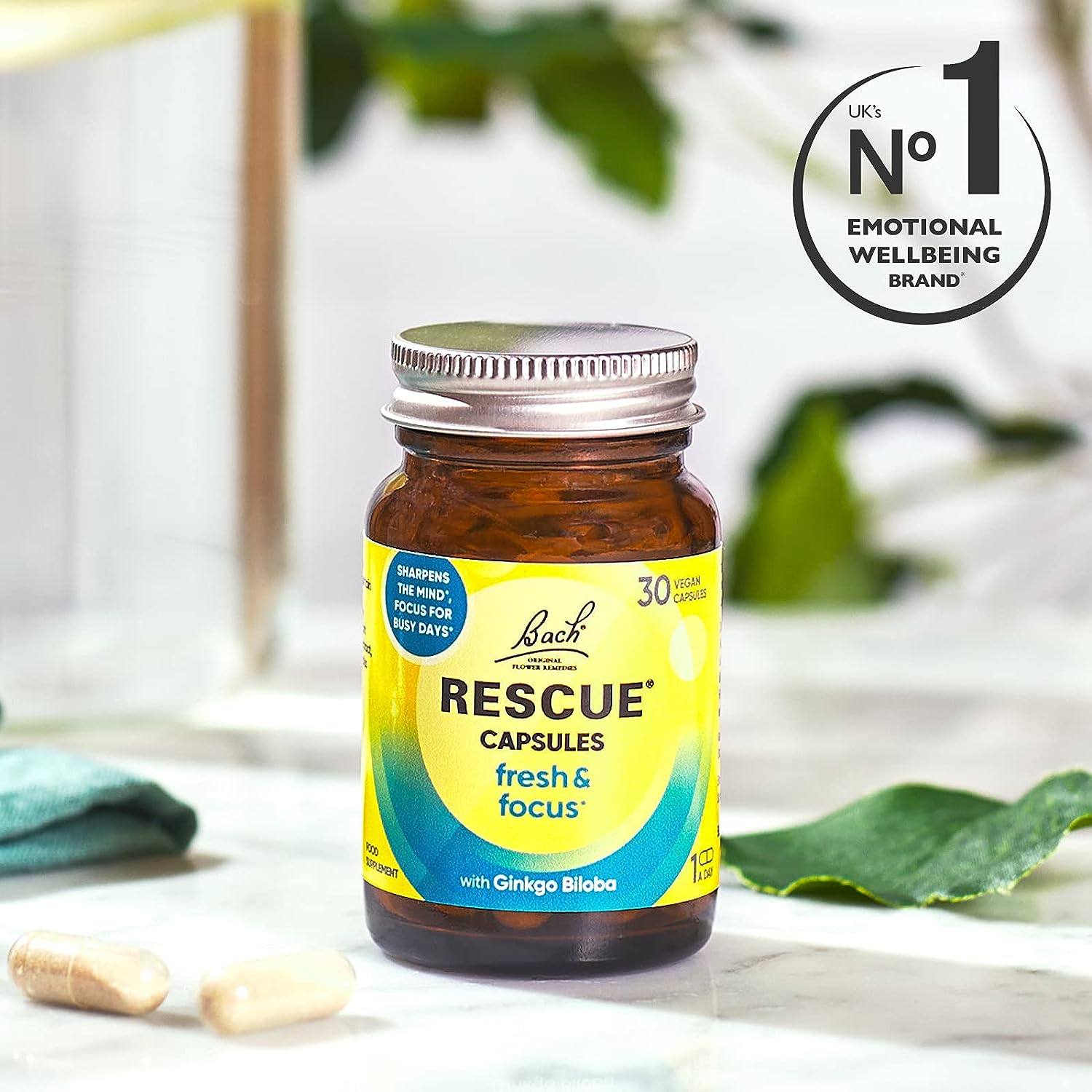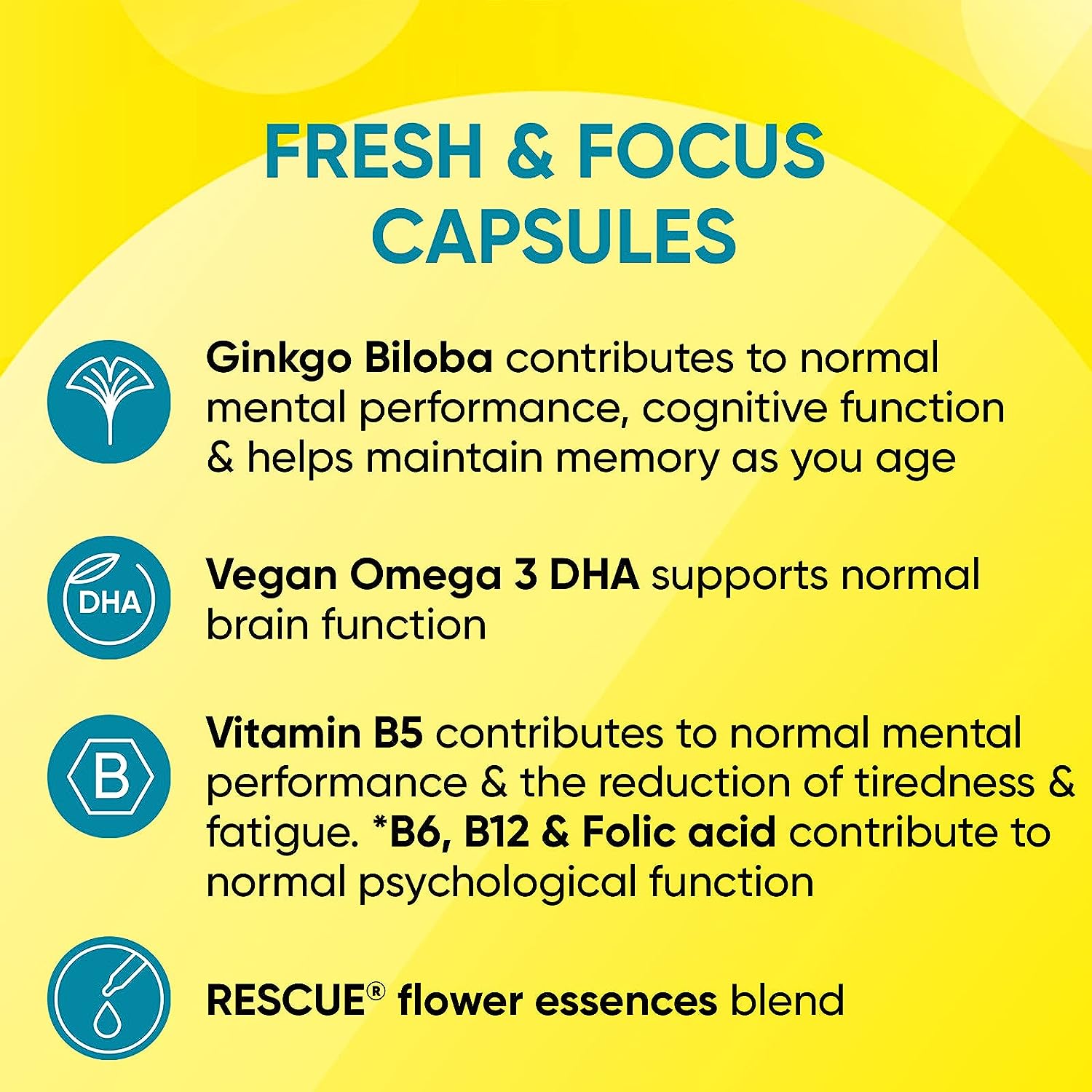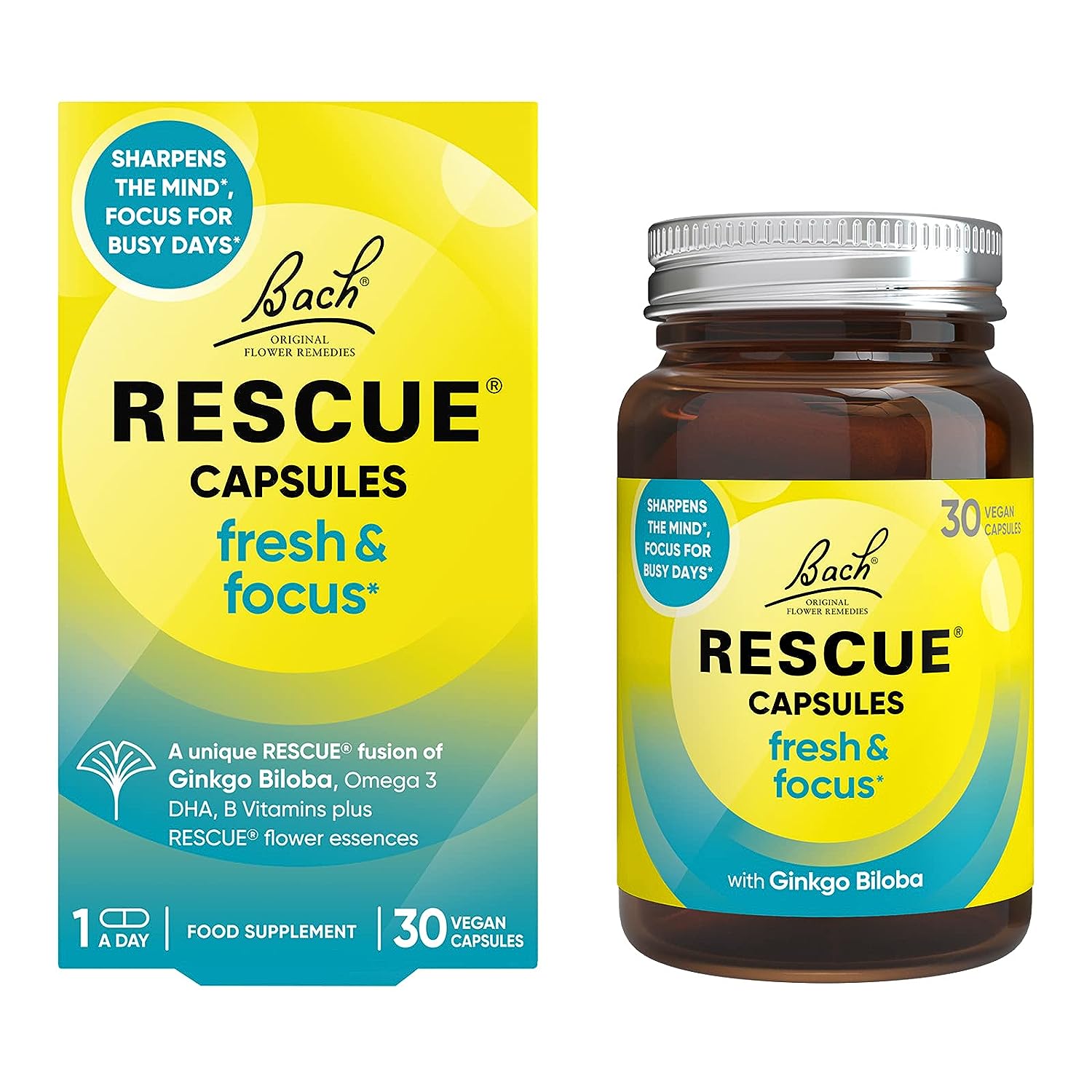 RESCUE Fresh & Focus capsules are a specially formulated active fusion of ingredients to support mental clarity, whatever you dray demands. They include: Ginkgo Biloba contributes to normal mental performance, cognitive function and helps to maintain memory as you age. Vegan DHA supports normal brain function. Vitamin B5 contributes to normal mental performance & the reduction of tiredness and fatigue. Vitamins B6, B12 and Folic acid contribute to normal psychological function. RESCUE Flower essences - original blend, perfected to comfort and reassure