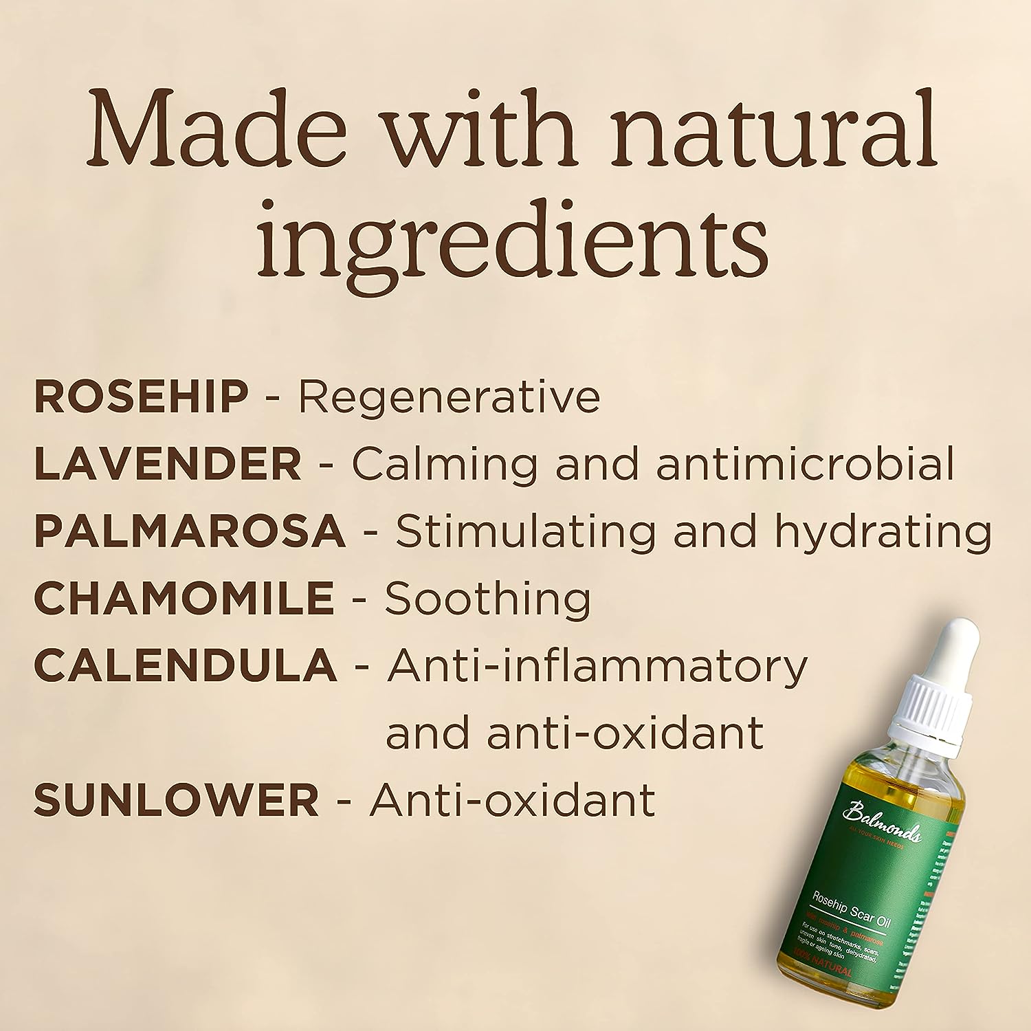 IngredientsVitis Vinifera (grape) seed oil, Rosa Canina (rosehip) fruit oil, Helianthus Annuus (sunflower) seed oil*, Tocopheryl (Vitamin E), Calendula Officinalis (calendula) macerated flower oil*, Anthemis Nobilis (Roman Chamomile) essential oil*, Lavandula Angustifolia (lavender) essential oil*, Cymbopogon Martini (palmarosa) essential oil, Geraniol & Linalool (from essential oils)