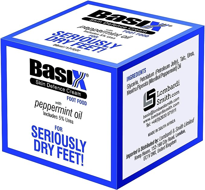 Basix Skin Defence Foot Food for Seriously Dry Feet with peppermint oil and 5% urea, soothes and repair dry feet and cracked heels, stimulates and invigorates tired feet. ULTIMATE FOOT CREAM FOR SERIOUSLY DRY FEET - with 5% Urea and Peppermint Oil, containing natural anti-itch, anti-bacterial, anti-inflammatory and natural anaesthetic properties, BASIX FOOT FOOD cools and revives tired feet, leaving feet and heels feeling soft and supple. RESTORES & REPLACES LOST MOISTURE - Exfoliate calloused areas to remove build-up of dead skin. Use Basix FOOT FOOD to restore and replace moisture deep within the skin cells. For best results apply at night and wear a sock while the Foot Food goes to work. NATURALLY EXFOLIATES - Basix FOOT FOOD foot balm is a natural exfoliant which helps shed dead skin. FOR SERIOUSLY TIRED FEET - The menthol in the peppermint creates a soothing cooling sensation that stimulates aching feet and heels. suitable for Running, cycling, hiking, football, rugby, in fact anyone who is on their feet all day will enjoy the invigorating effects of Basix FOOT FOOD. Basix Skin Defence FOOT FOOD has been formulated with carefully chosen ingredients to repair and restore dry feet and cracked heels. With 5% Urea and petroleum jelly, this incredible foot cream has been designed to attract and retain moisture, while forming a protective barrier that helps lock water into the skin cells. The added benefit of Peppermint Oil creates a soothing, stimulating effect that helps revive tired aching feet. For best results, exfoliate and dead loose skin on heels and feet, apply liberally and wear a sock after application for maximum absorption.
