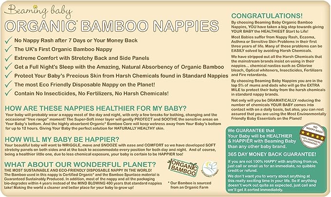 Beaming Baby's Organic Bamboo Nappies contain 56% LESS Chemicals than standard nappies (and 40% less than other eco-nappies). By using Beaming Baby's Organic Bamboo Nappies, you have shown that you are in the TOP 5% of Mums and Dads who will go the EXTRA MILE to protect your baby from the harsh chemicals in standard baby products. Not only will you be DRAMATICALLY reducing the number of chemicals which YOUR BABY comes into contact with on a daily basis, but also, you can rest assured that you are using the Most Environmentally Friendly Baby Essentials on the Planet! Not only have we RADICALLY reduced the chemicals in these nappies, and removed any Harsh Chemicals altogether, but we have also introduced a Super-soft inner layer to gently protect and soothe the sensitive areas on Your Baby's bottom. Combined with a Highly Absorbent Organic Bamboo Core to keep the wetness away from your baby's bottom for up to 12 hours. These are The World's Most Advanced, Environmentally Friendly Disposable Nappies with Premium Performance, designed for Superior Comfort during an active day and to last for up to 12 hours to encourage a Good Night's Sleep! They use 56% Less Chemicals than Standard Disposable Nappies and are Kind to All Babies; especially for those with Skin irritation or Sensitive Skin. Your Beautiful Baby will want to WRIGGLE, move and SNOOZE with ease and COMFORT so we have developed Brushed SOFT and stretchy Bamboo Fibre material around the legs, tummy and at the back to accommodate every position for both day and night. And of course, being a Healthier Little One, due to less chemical exposure, Your Baby is certain to be HAPPIER too!