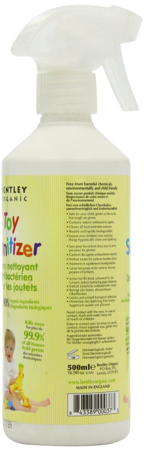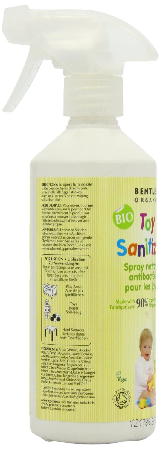 This unique product is free from harmful chemicals and is proven to kill 99.9% of germs leaving your childs toys and play things hygienically clean and sparkling. Bentley Organic has been created out of a passion for soap making that has been in the Bentley family for five generations. Combining expertise with innovation, we have succeeded in producing a unique range of Soil Association certified organic products for you, your family and your home. We provide products of genuine organic integrity at an affordable price, without compromise in formulation or function - making organic lifestyle choices more accessible for all.Remove security clip from trigger neck. Spray directly onto surface with full trigger strokes. Leave for 30 seconds before wiping with a clean cloth.Aqua, Alcohol Denat, Decyl Glucoside, Lauryl Betaine, Aloe Barbadensis Leaf Juice Powder, Lactic Acid, Glycerin, Citrus Aurantium Bergamia (Bergamot) Fruit Extract, Citrus Paradisi (Grapefruit) Fruit Extract, Citrus Aurantium Dulcis (Orange) Fruit Extract, Citrus Tangerina (Tangerine) Extract, Ascorbic Acid, Citric Acid, Citrus Medica Limonum Peel Oil