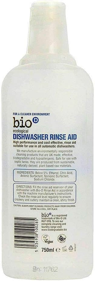 Bio-D high-performance dishwasher rinse aid can be used in all types of dishwashing machines - its cost-effective and ensures gorgeous, gleaming results each time. It helps to reduce spotting and smearing for a fresh, clean finish on crockery and cutlery.