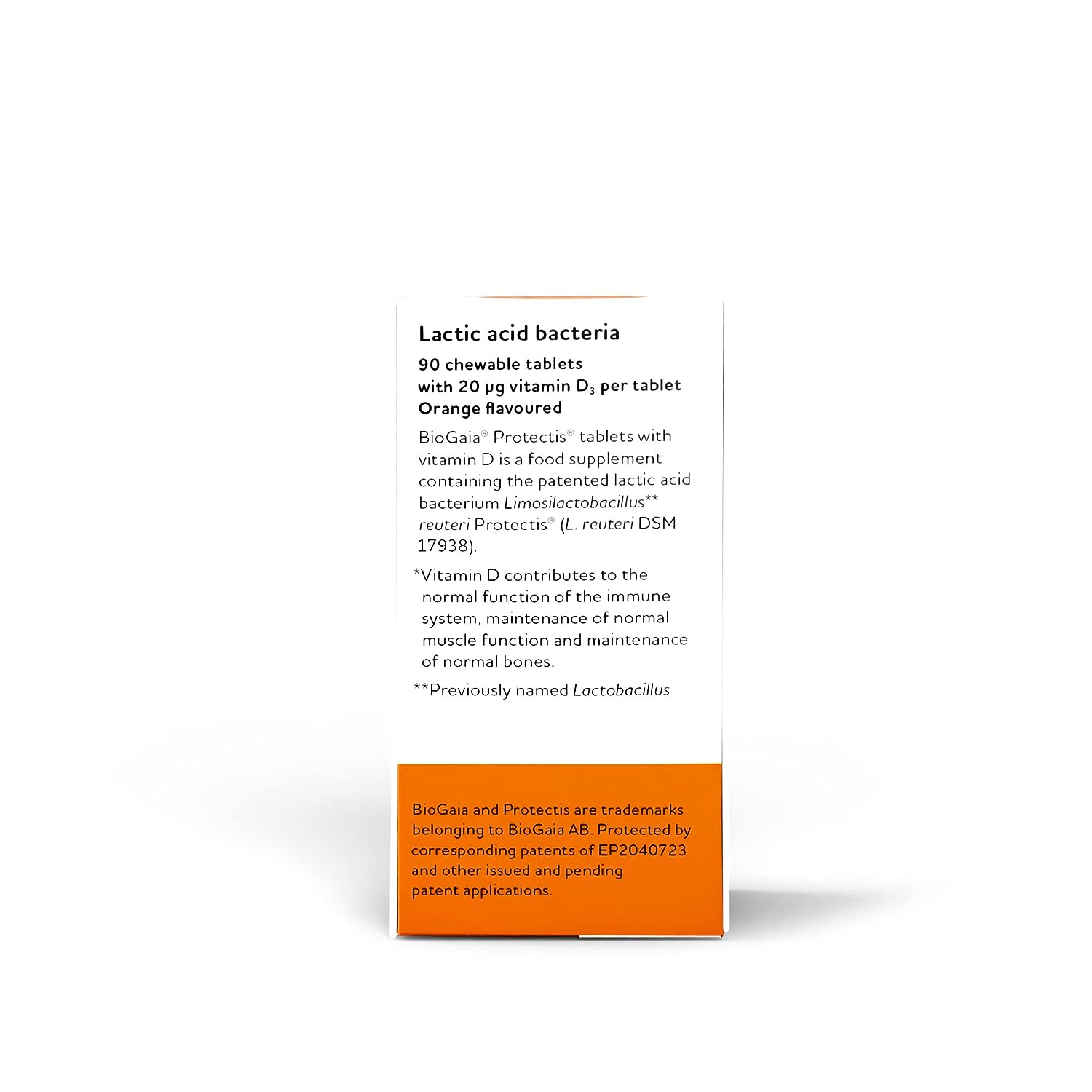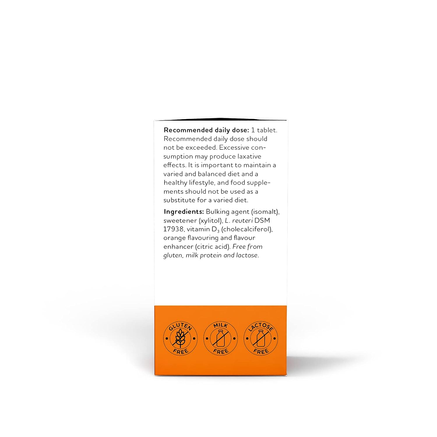 IngredientsBulking agent (isomalt), sweetener (xylitol), Limosilactobacillus reuteri DSM 17938, orange flavouring, vitamin D3 20mcg and flavour enhancer (citric acid).