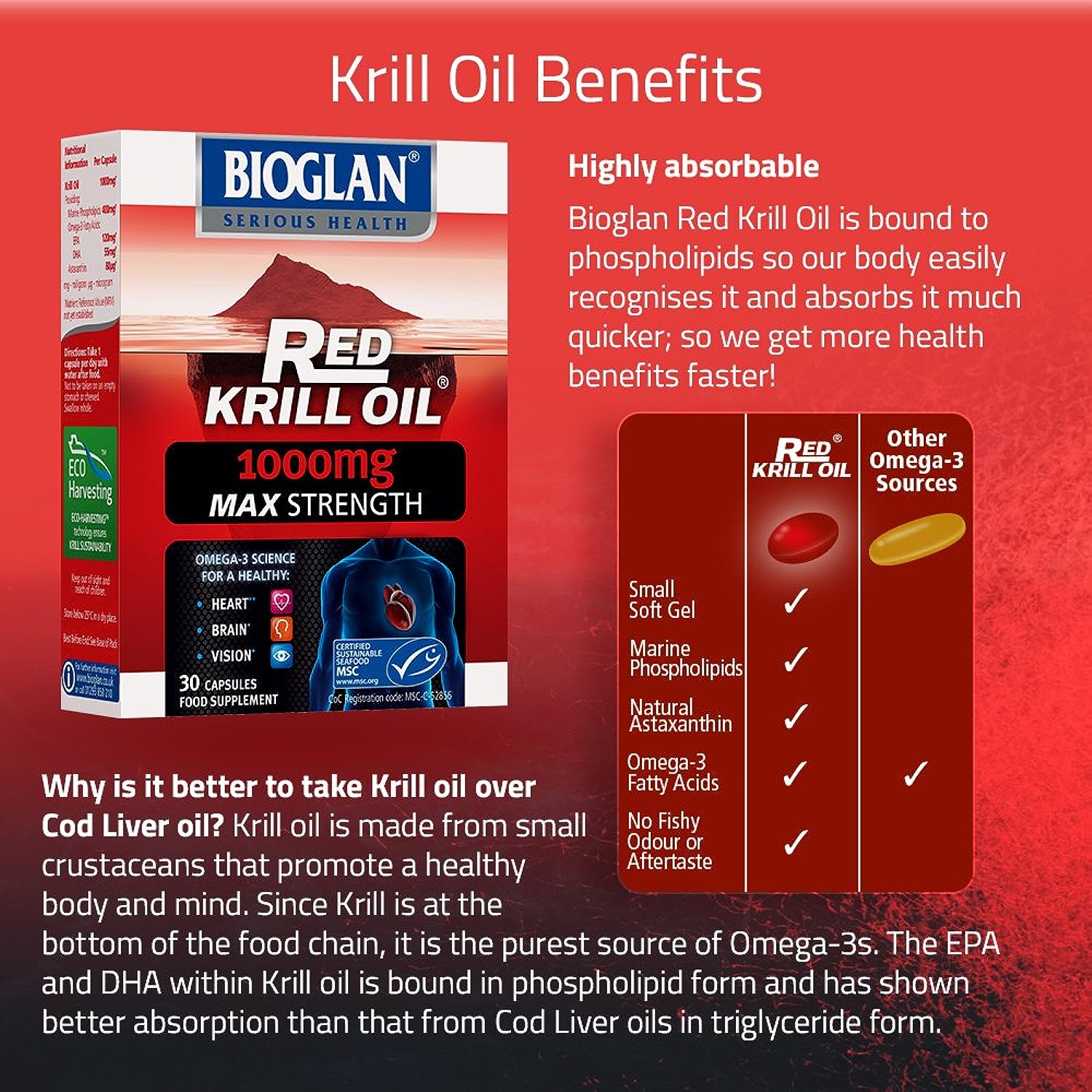 Bioglan Red Krill Oil Double Strength 1000mg contains pure, sustainably sourced Red Krill Oil in high concentration, to give extra support for your heart, eye and brain health. Bioglan Red Krill Oil Double Strength contains 1000mg pure Krill Oil sourced from the pristine waters of the Antarctic Ocean. Red Krill Oil is a pure source of Omega-3 providing highly absorbable phospholipid bound Eicosapentaenoic Acid (EPA) and Docosahexaenoic Acid (DHA). Phospholipids are important structural components of each cell membrane in the human body and give Red Krill Oil significantly greater bioavailability than fish oils. The potent red colour of Red Krill Oil comes from the naturally occurring carotenoid Astaxanthin, which helps keep the oil nice and fresh.
