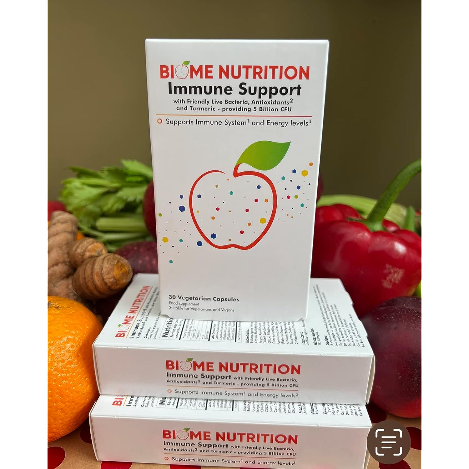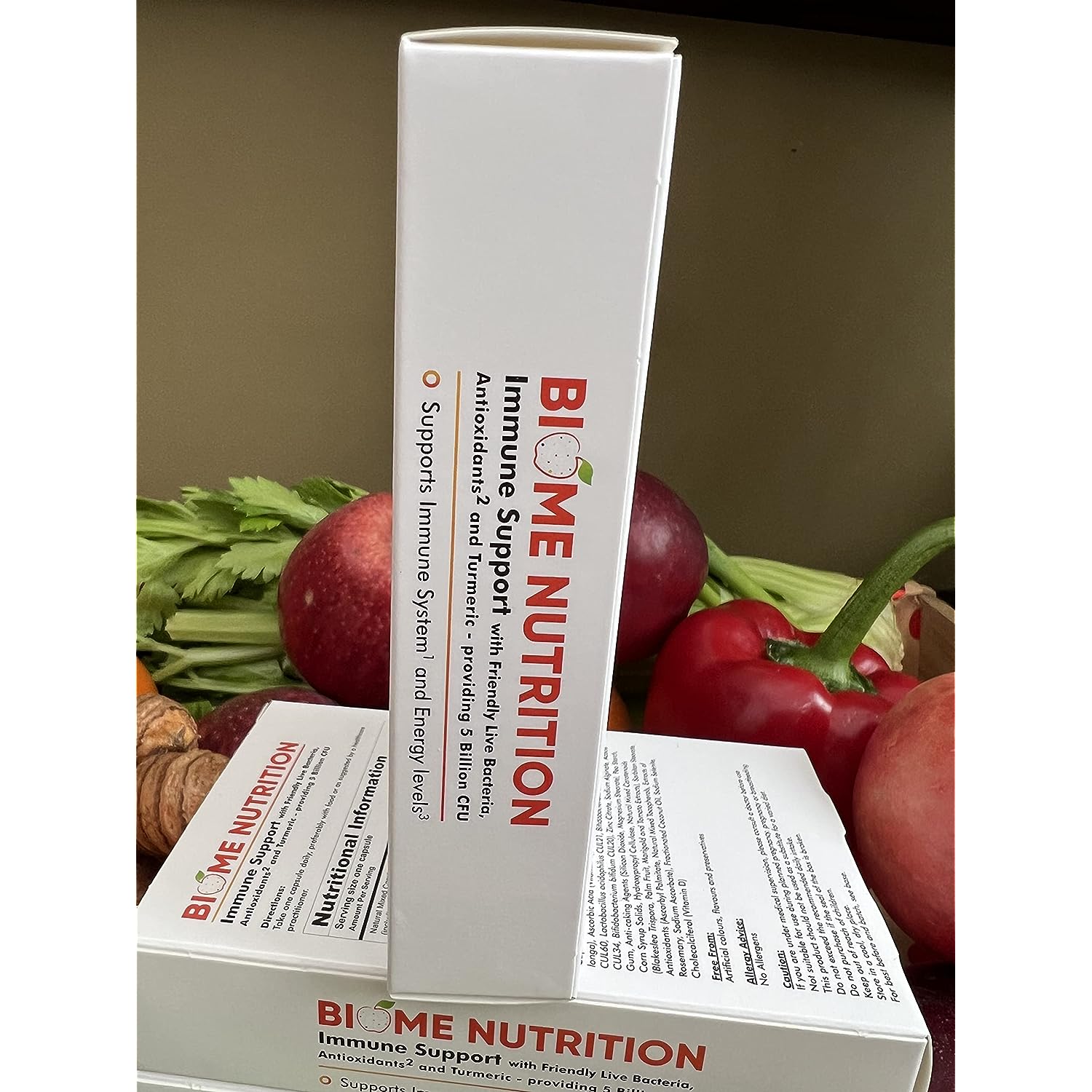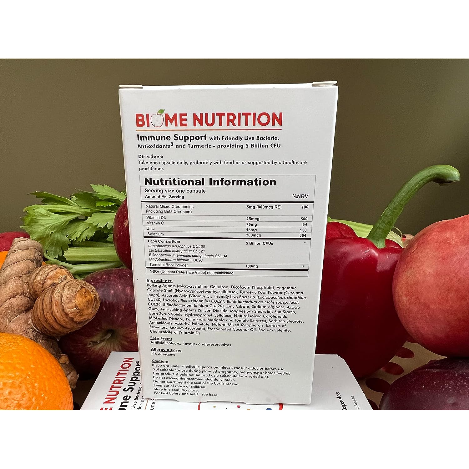 IngredientsBulking Agents (Microcrystalline Cellulose, Dicalcium Phosphate), Vegetable Capsule Shell (Hydroxypropyl Methylcellulose), Turmeric Root Powder (Curcuma longa), Ascorbic Acid (Vitamin C), Friendly Live Bacteria (Lactobacillus acidophilus CUL60, Lactobacillus acidophilus CUL21, Bifidobacterium animalis subsp. lactis CUL34, Bifidobacterium bifidum CUL20), Zinc Citrate, Sodium Alginate, Acacia Gum, Anti-caking Agents (Silicon Dioxide, Magnesium Stearate), Pea Starch, Corn Syrup Solids, Hydroxypropyl Cellulose, Natural Mixed Carotenoids (Blakeslea Trispora, Palm Fruit, Marigold and Tomato Extracts), Sorbitan Stearate, Antioxidants (Ascorbyl Palmitate, Natural Mixed Tocopherols, Extracts of Rosemary, Sodium Ascorbate), Fractionated Coconut Oil, Sodium Selenite, Cholecalciferol (Vitamin D3)