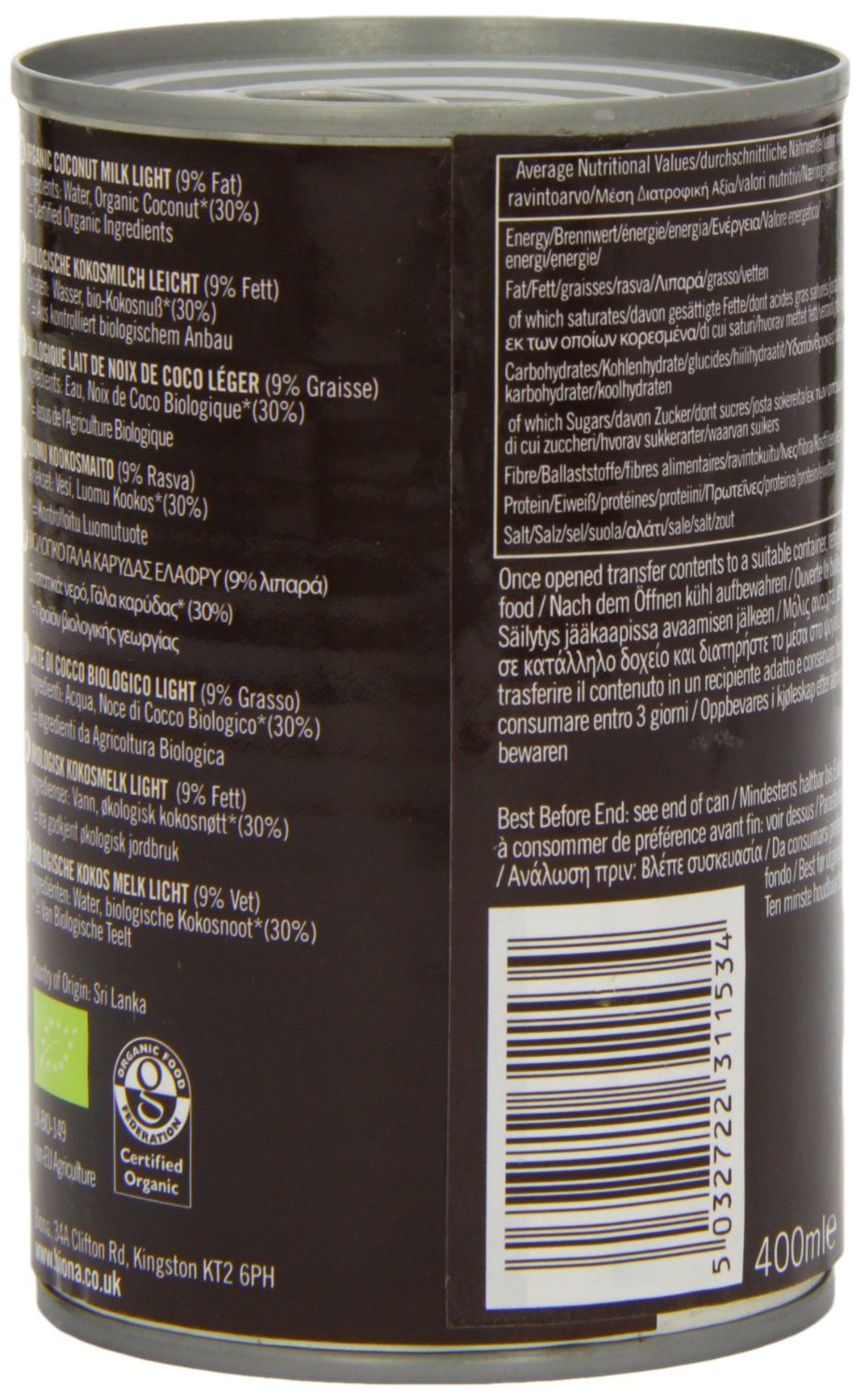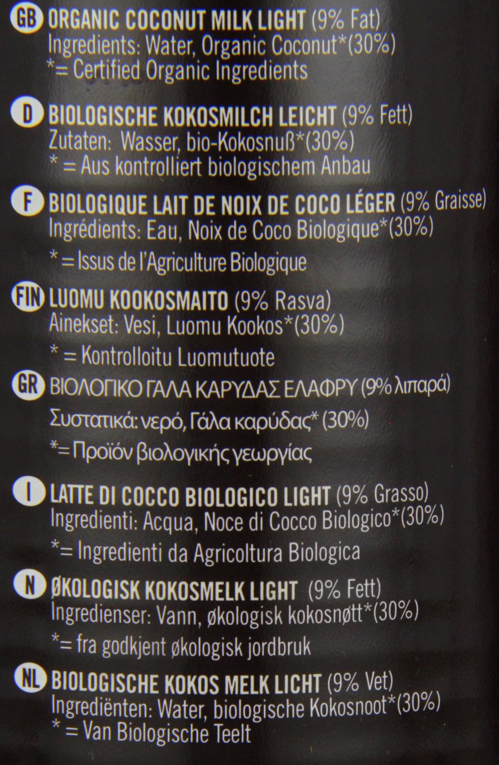 Biona Organic Light Coconut Milk is a reduced fat version of this popular cooking ingredient with just 9 percent fat. Made from certified organic coconuts, this coconut milk can be used in Indian and Thai cuisine to give dishes a rich, sweet and silky finish, but with less fat than traditional coconut milk.
