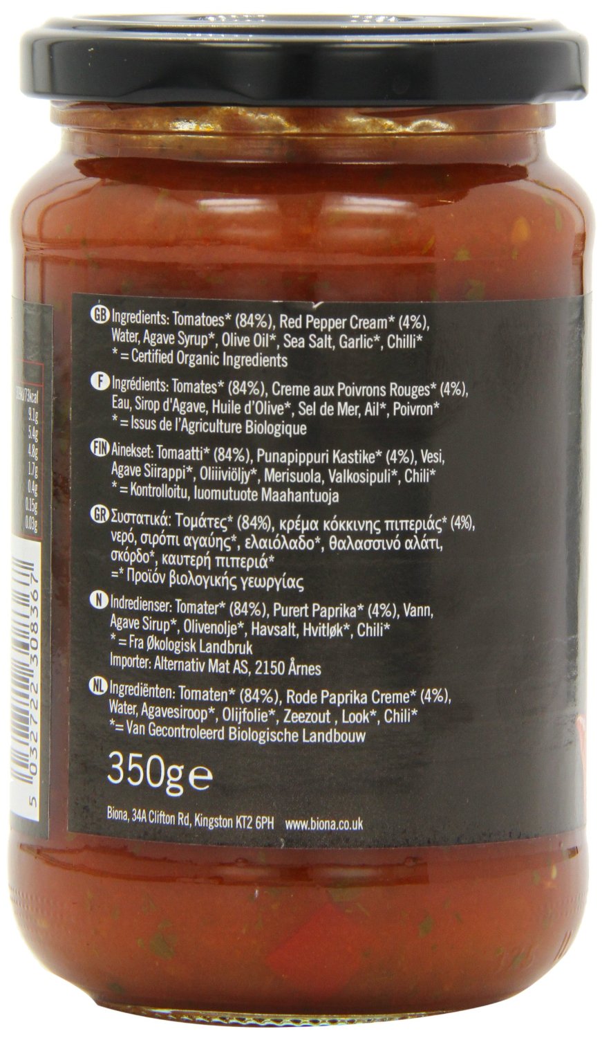 IngredientsTomatoes*(84%), Red Peppers*(5%), Agave Syrup*, Water, Olive Oil*, Sea Salt, Garlic*, Chilli*, Parsley*. * = Certified Organic Ingredients.