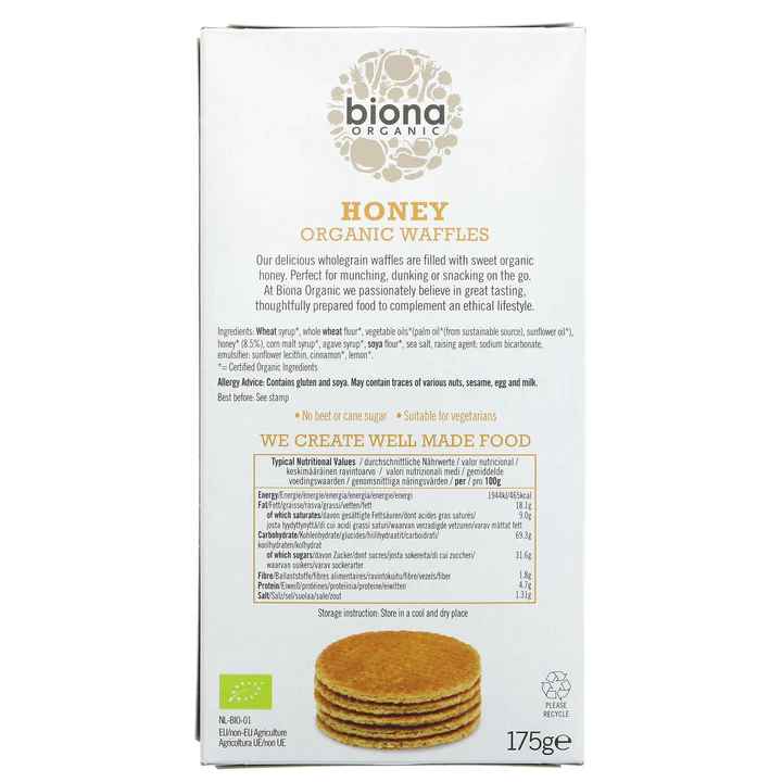 IngredientsWheat Syrup*, Wheat Flour* (21%), Vegetable Oils* (Palm Oil*, Sunflower Oil*), Honey* (8.5%), Agave Syrup*, Whole Wheat Flour* (3.5%), Sunflower Protein*, Sea Salt, Raising Agent (Sodium Carbonate), Emulsifier (Sunflower Lecithin*), Cinnamon*, Lemon
