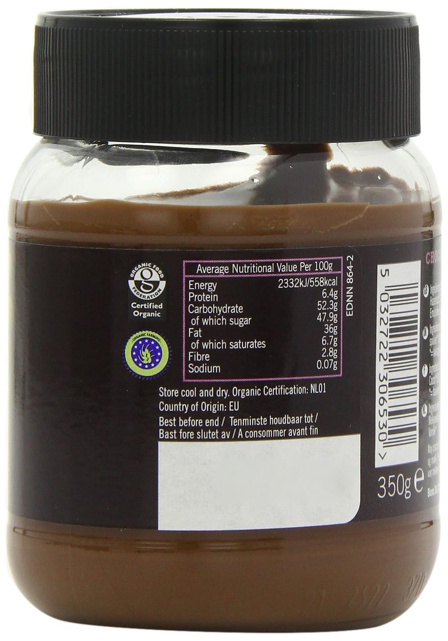 IngredientsCane Sugar*, Sunflower Oil*, HAZELNUTS*(10%), Low Fat Cocoa Powder*(5%), Skimmed MILK Powder*(5%), SOYA Flour*, Cocoa butter*, Emulsifier: SOYA lecithin, Bourbon vanilla extract*. * = Certified Organic Ingredients.