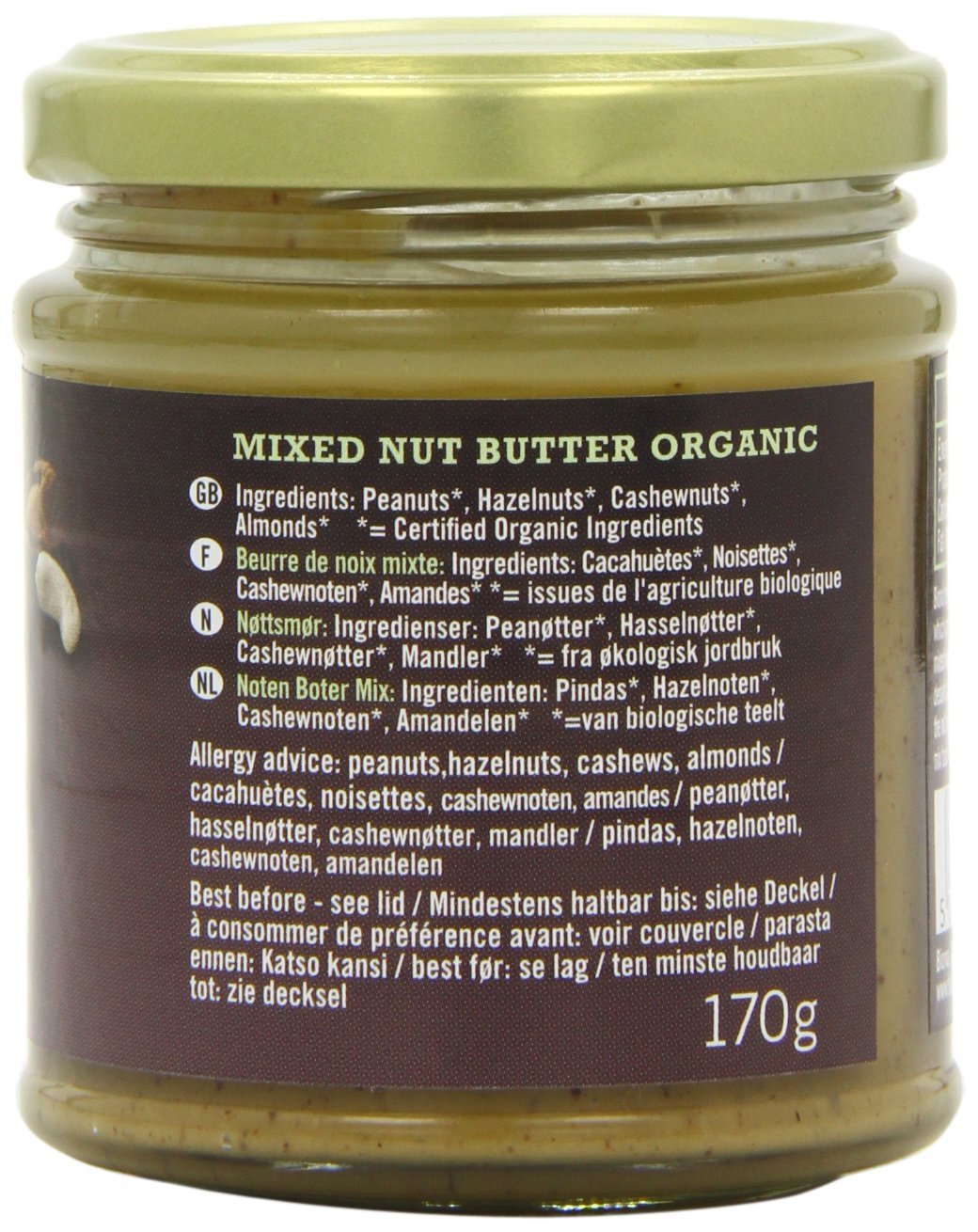 IngredientsPEANUTS*, HAZELNUTS*, CASHEW NUTS*, ALMONDS*. * = Certified Organic Ingredients.