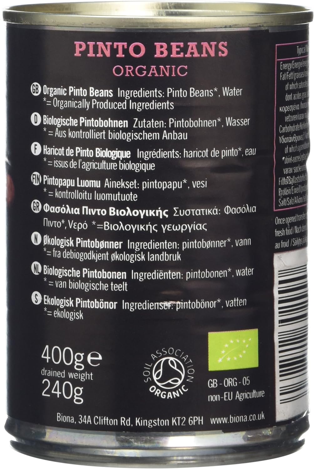 Biona Organic Canned Pinto Beans are 100 percent natural with no added salt or sugar and come in a BPA free can. They are a great source of plant based protein, fibre, iron and magnesium as well as being naturally low in fat, salt and sugar. Pinto beans can be used in a wide variety of delicious dishes, why not take inspiration from Mexico and add to your next chilli con carne or burrito. This versatile bean also tastes great when added to salads, upping its nutritional content. It is suitable for vegan.