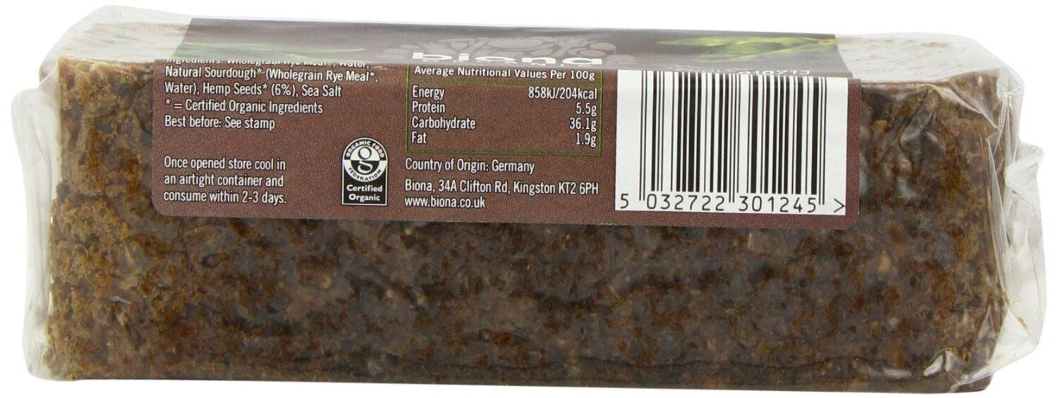 IngredientsWholegrain RYE Meal*, Water, Natural Sourdough* (Wholegrain RYE Meal*, Water), Hemp Seeds*(6%), Sea Salt. * = Certified Organic Ingredients.