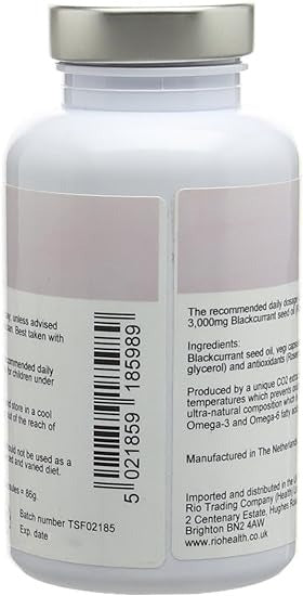 IngredientsBlackcurrant seed oil (Ribes nigrum) 2,000 mg. Additional ingredients: Rosemary extract in sunflower oil. Vegicapsules (modified cornstarch, glycerol).