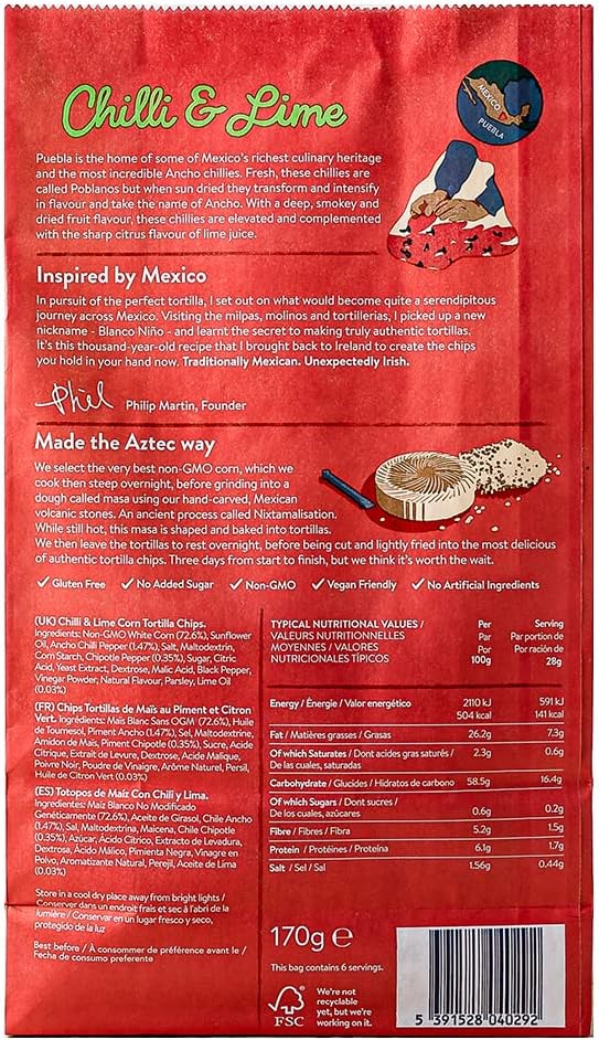 IngredientsNon-GMO White Corn (88.8%), Salt, Brown Rice Flour, Citric Acid, Sugar, Chilli Powder (0.8%), Paprika, Ancho Chile (0.2%), Sodium Bicarbonate, Onion Powder, Lime Juice Powder (0.2%), Yeast Extract, Cayenne Pepper, Sunflower Oil, Tartaric Acid, Calcium Silicate