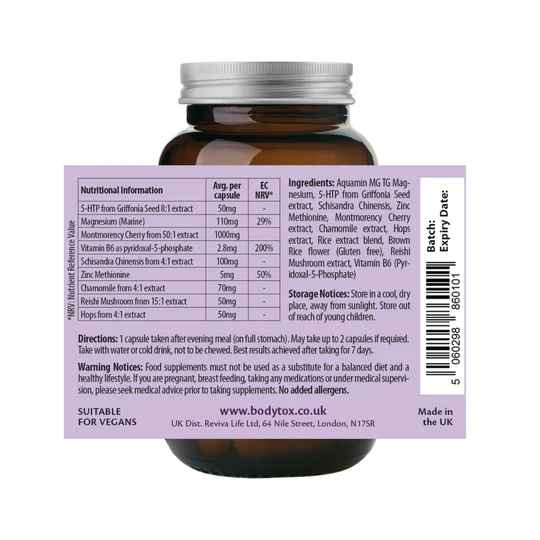 Bodytox Night Time Calming Sleep Support provides a powerful, specific blend of nine vitamins, minerals, botanicals which has been expertly formulated by nutritionists to help mellow your mood and with keeping you calm for you to enjoy a restful night?s sleep. Scientifically Advanced Neuro Night uses 5-HTP & Cherries as a source of melatonin, that helps contribute to the body?s natural sleep cycles and circadian rhythms. Magnesium play a supportive role in deep, restorative sleep by maintaining healthy levels of GABA ( neurotransmitter) that promotes sleep. B6 in its ?active? and readily usable form (as Pyridoxal-5-phosphate) contributes to the normal functioning of the nervous system and psychological function, helps to support Melatonin biosynthesis, and reduce tiredness & fatigue. Chamomile & Hops, together with stress and hormonal balancing Reishi Mushroom & Schisandra extract, help to promote calm and relaxation and a soothing transition to restful nights sleep.