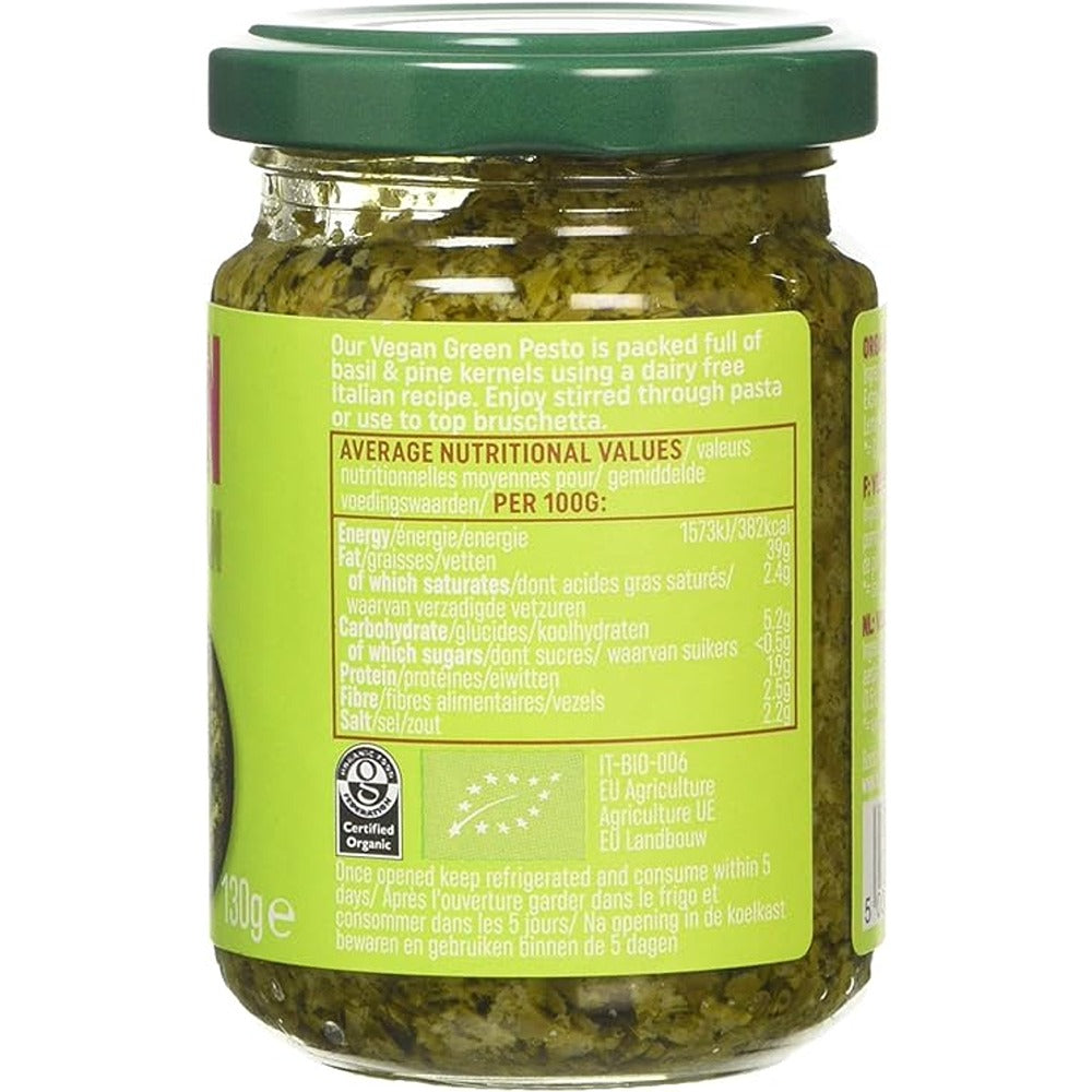 Bonsan Vegan Organic Green Pesto is made without dairy.It is packed full of basil, pine kernels and extra virgin olive oil for a bright and zesty flavour. This tasty pesto is perfect stirred into pasta, drizzled over grilled vegetables or spread in sandwiches! Also available as a red pesto.