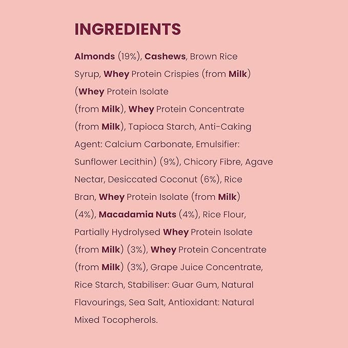 Blue Agave Syrup, Inulin (Dietary Fibre), CASHEWS (12%), Whey Protein Isolate (from MILK) (11%), Coconut (8%), Whey Protein Concentrate (from Milk) (7%), Rice Bran, Brown Rice Flour, MACADAMIAS (6%), Stabiliser (Guar Gum), Tapioca Starch, Flavourings, Whey Protein Hydrolysate (from MILK) (1.5%), Safflower Oil, Vanilla Extract, Sea Salt, Antioxidant (Natural Mixed Tocopherols), SESAME SEEDS, Stabiliser (Calcium Carbonate), Emulsifier (Sunflower Lecithin)