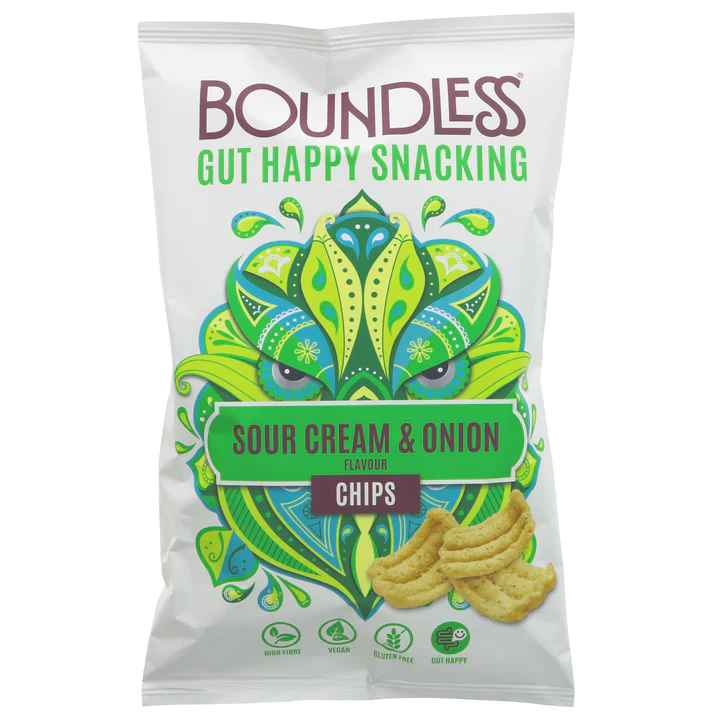 Indulge in the irresistible tang of Boundless Sour Cream & Onion Chips. Made with real ingredients, these gluten-free and vegan chips are perfect for guilt-free snacking. Enjoy them on their own or pair them with your favorite dip for a flavorful treat. These gut happy chips are 100% activated full of gut friendly fibre and packed with nutrients. Made from the powerhouse Sorghum which is regeneratively grown in Gloucestershire. Vegan society and Coeliac society certified. 1p per bag is donated to the charity Frank Water. 80g sharing bag.