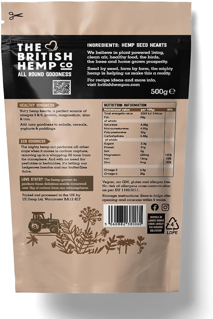 Our hearts are hemp seeds with the tough outer shells removed. They have all the benefits of our cold pressed hemp seed oil & protein powders. They are naturally high in omegas 3, 6 and 9 in the perfect ratio to support immune health, cardiovascular health while helping to to regulate glucose metabolism. The oil in our hemp hearts is anti inflammatory and helps with muscle and joint health. It also provides protein (30%) magnesium, manganese, phosphorous, zinc, iron and copper. How to use it They can go on pretty much everything but are particularly great with porridge, yoghurt, smoothies & salads or for making hemp milk. How much to use Add 2 dessert spoonfuls daily to your favourite dishes to enjoy the health benefits Eco-goodness Our hemp is grown in the UK without pesticides or herbicides; it also removes up to 20 tons of carbon per hectare. Great for the environment and great for UK farmers Winner 2022 Nourish Awards: Best Ethical Brand