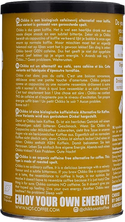Chikko is not coffee. It is a delicious drink with a nice deep taste and a subtle bitterness. Especially if you prepare Chikko as a cappuccino or coffee wrong, your cup of coffee looks very much like normal coffee in our view. Chikko does NOT contain any caffeine. So it doesn't give you that overpowered feeling. Live on your own energy.