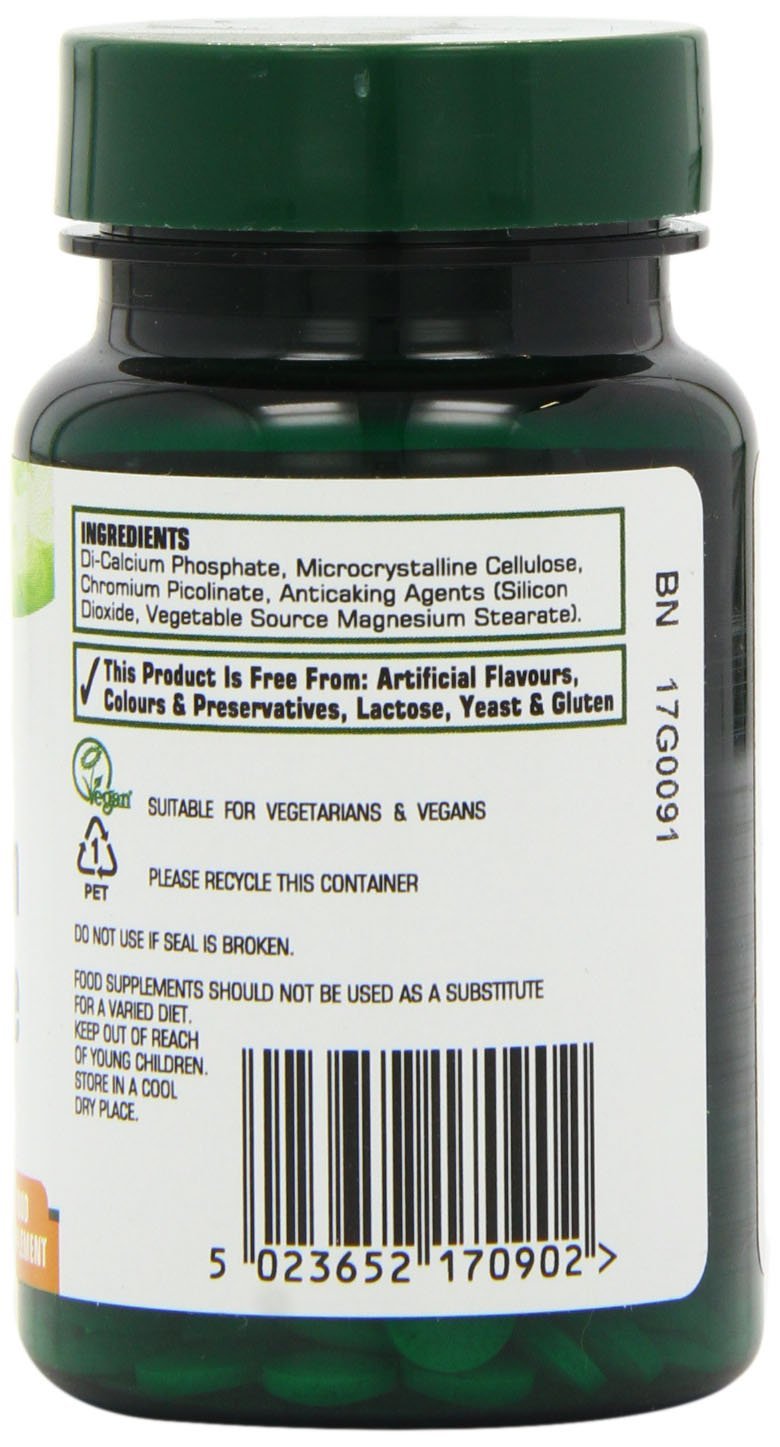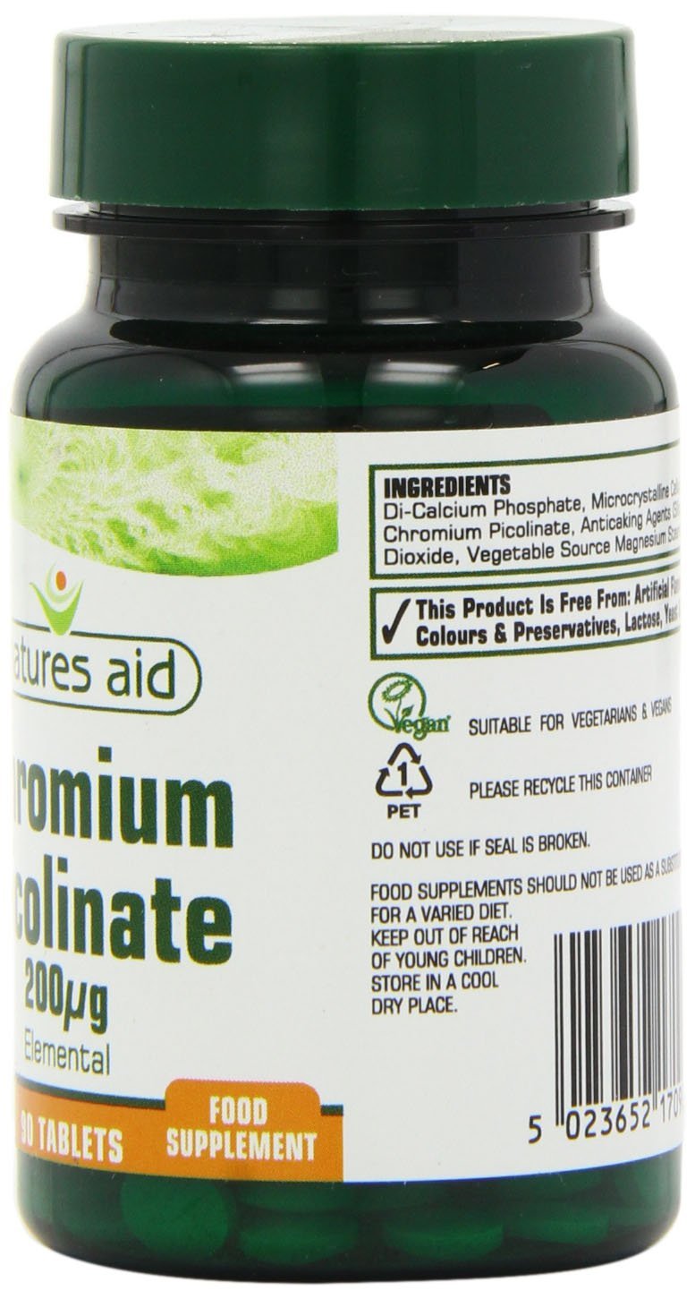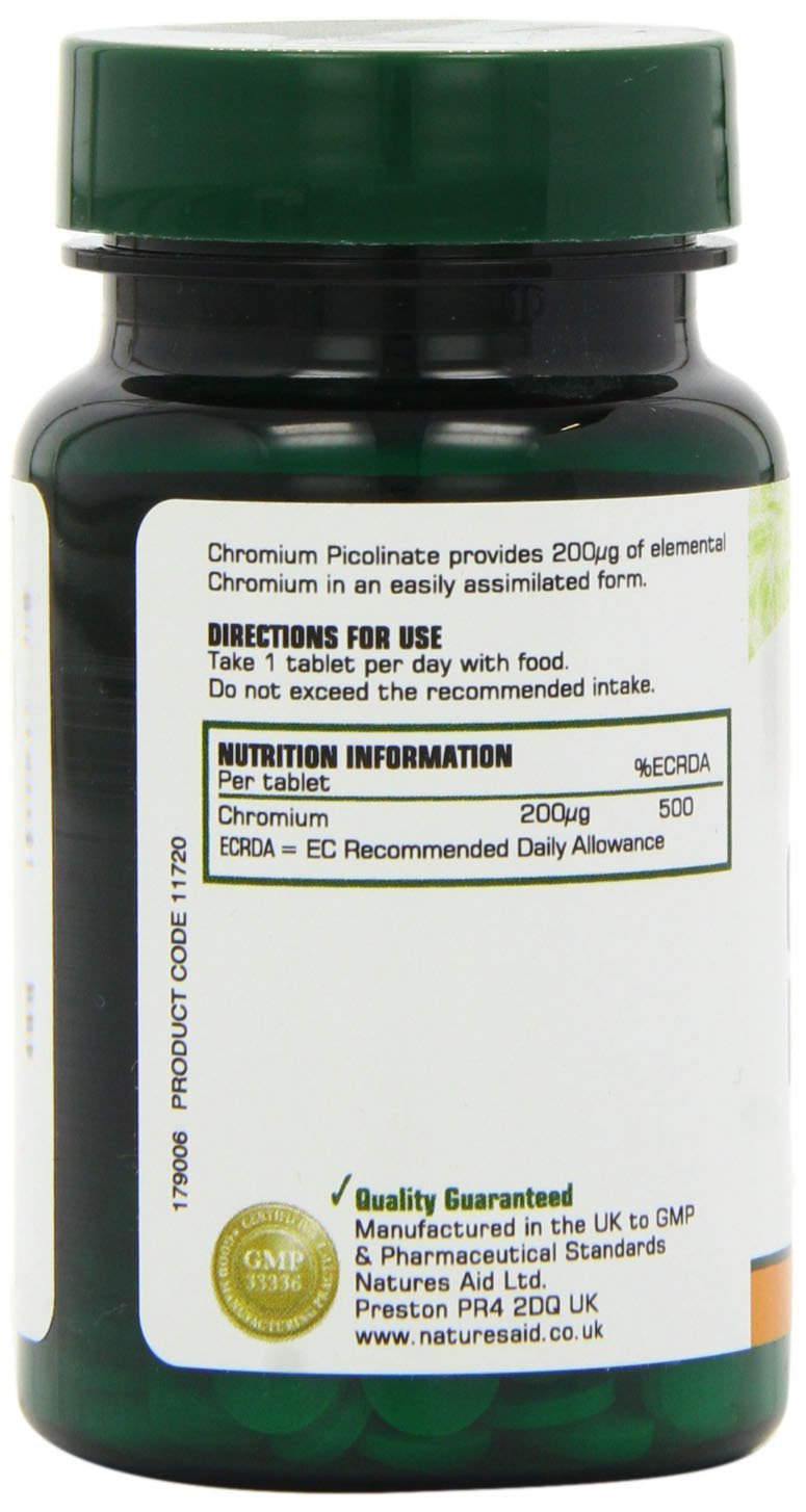 Natures Aid Chromium Picolinate provides a full 200mcg of Chromium per tablet. The product is formulated using the picolinate form of this mineral, for improved absorption rates. Chromium contributes to the maintenance of normal blood glucose levels. Chromium Picolinate would be a good choice for someone whose diet has consisted of high levels of processed foods and sugars.