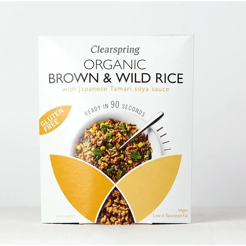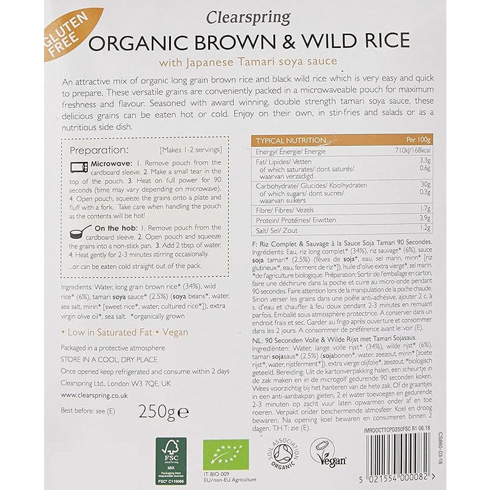 Clear spring Organic Brown and Wild Rice with tamari soya sauce is an attractive mixture of organic long grain brown rice and black wild rice which is very easy and quick to prepare. These versatile grains are conveniently packed in a microwaveable pouch for maximum freshness and flavour. Seasoned with double strength tamari soya sauce. These delicious grains can be eaten hot or cold. Enjoy on their own, in stir fries and salads or as a nutritious and colourful side dish.