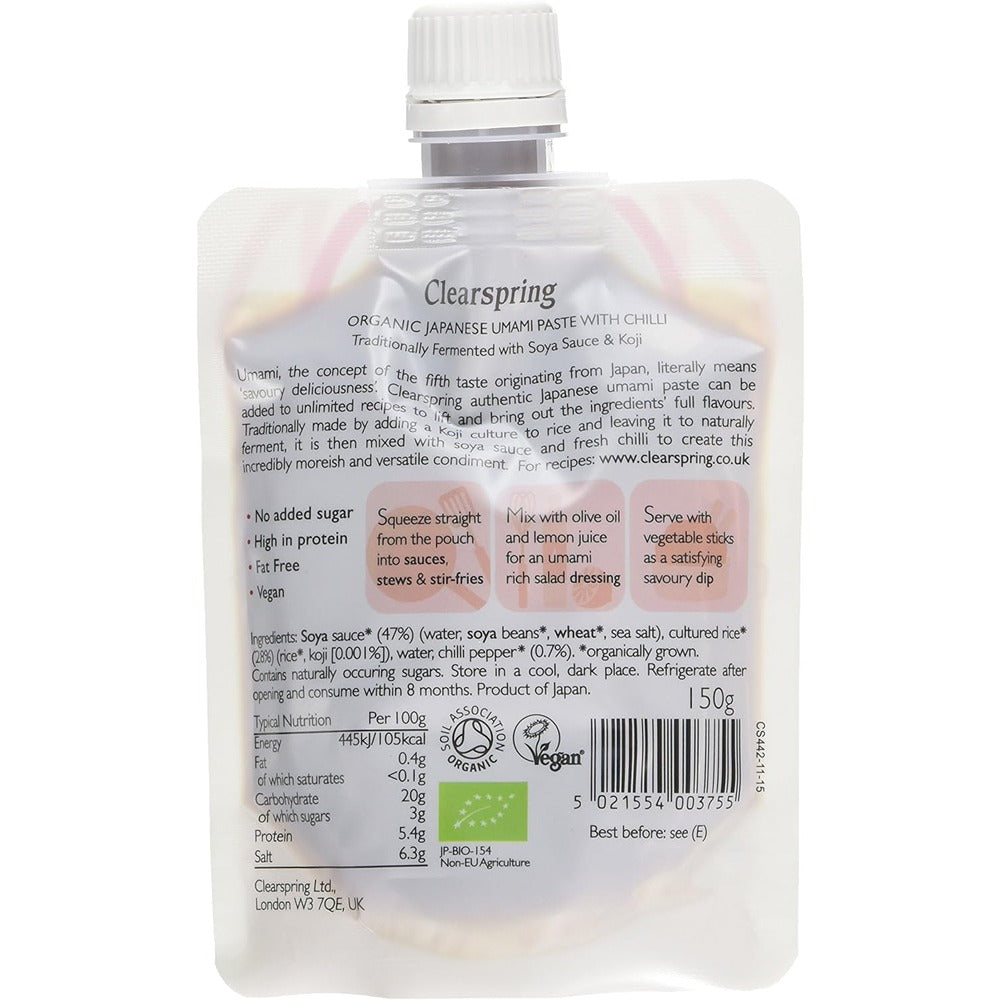 Clearspring?s organic Japanese umami paste with chilli is a paste which can be added to numerous dishes to enhance their overall Umami flavour. Think of it as a natural flavouring, which will enhance the taste of any dish. Traditionally made by adding a Koji culture to rice and leaving it to naturally ferment, the Umami is then mixed with soya sauce and chilli to create this incredibly moreish and versatile condiment.