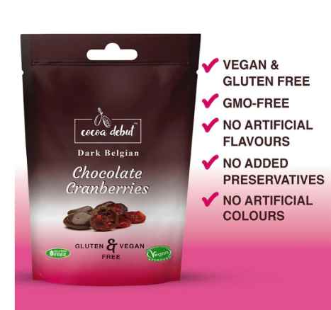Juicy Cranberries Coated in Smooth Dark Belgian Chocolate, Vegan & Gluten Free - 45g The perfect combination of sweet and tangy, chewy and crunchy. Our Belgian chocolate-coated cranberries will give your tastebuds a tingle and your body a health boost.