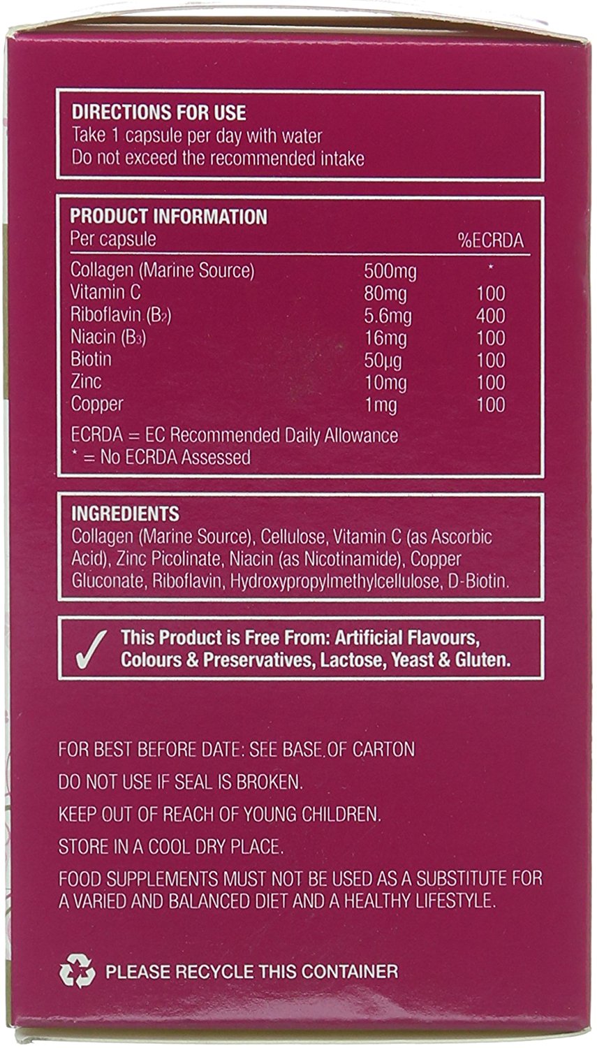 IngredientsCollagen (Marine Source), Cellulose, Vitamin C (as Ascorbic Acid), Zinc Picolinate, Niacin (as Nicotinamide), Copper Gluconate, Riboflavin, Hydroxypropylmethylcellulose, D-Biotin.