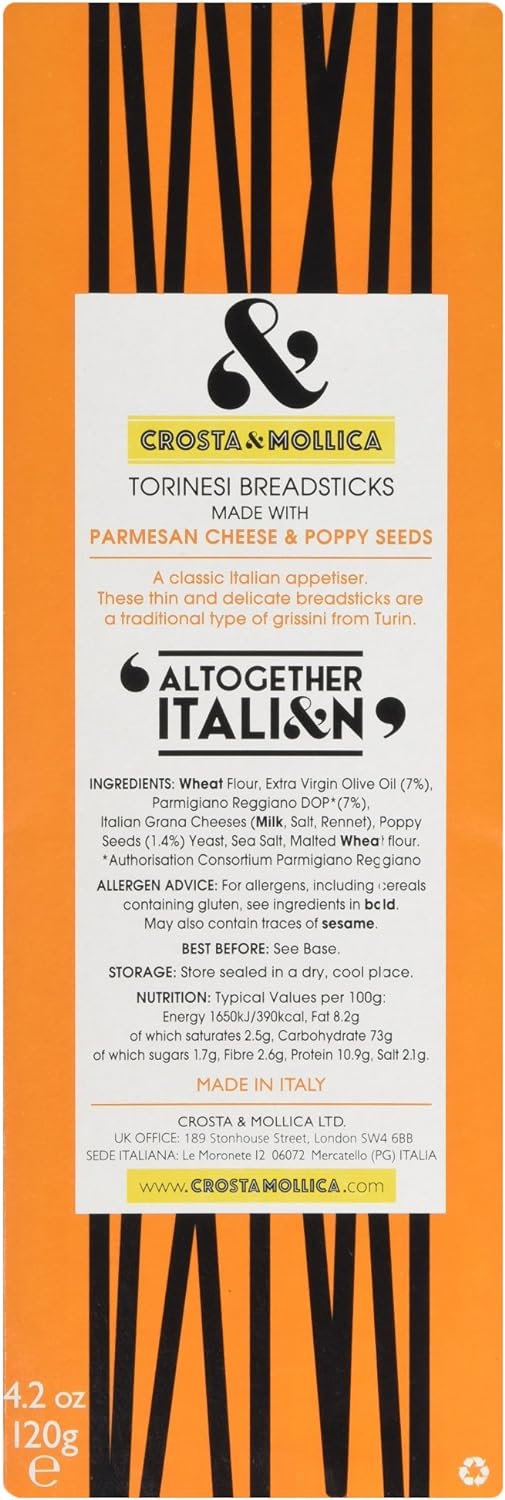 WHEAT Flour , Extra Virgin Olive Oil (7%), Parmigiano Reggiano DOP* (7%), Italian Grana Cheeses (MILK, Salt, Rennet) , Poppy Seeds (1.4%), Yeast, Sea Salt, Malted WHEAT Flour , *Authorisation Consortium Parmigiano Reggiano