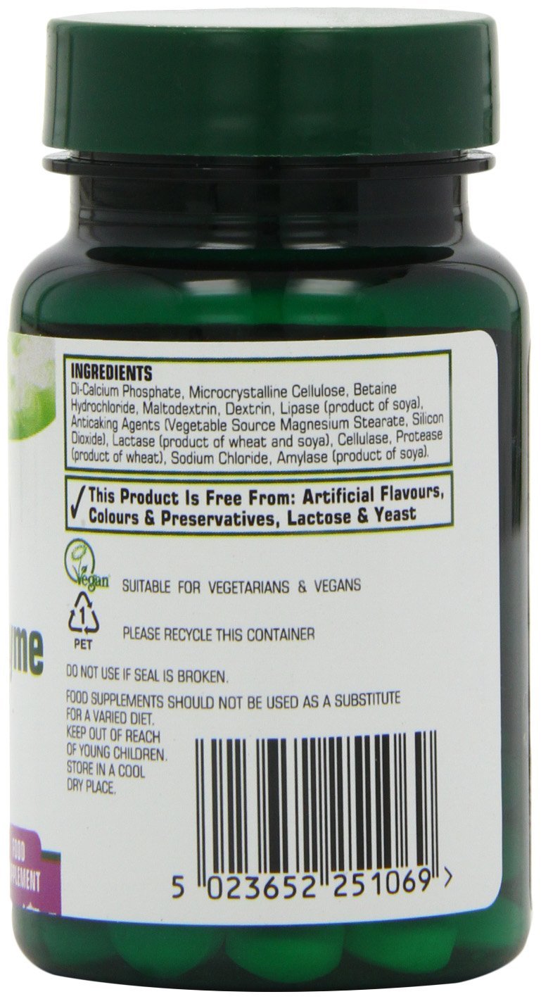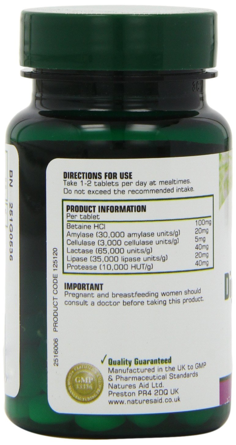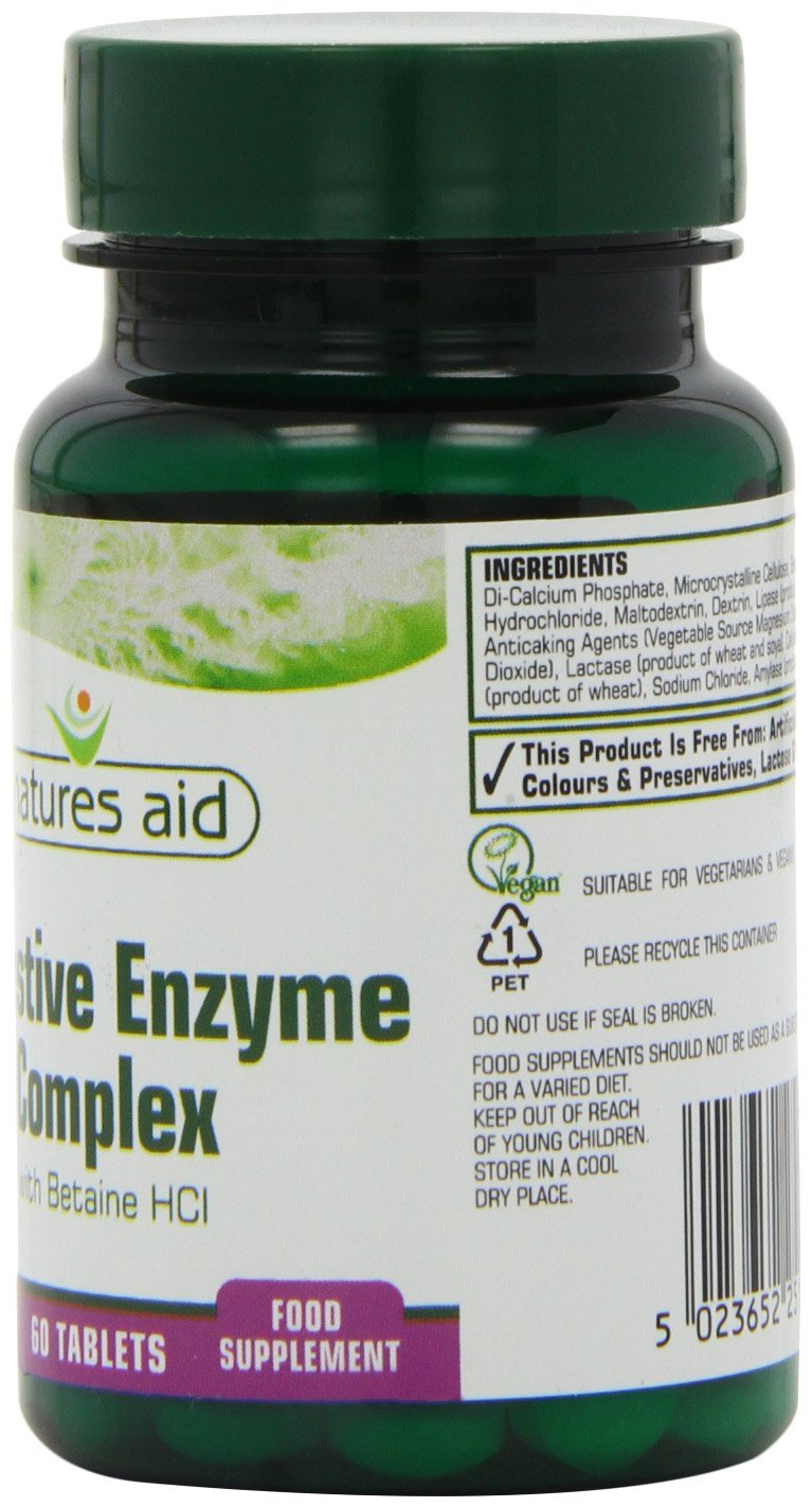 The Natures Aid Digestive Enzyme complex Tablets Contains amylase, protease, lipase, lactase and cellulase plus betaine HCl. Digestive enzymes are usually produced in the digestive system and are responsible for the breakdown of the food we eat. Age and illness can negatively affect the production of digestive enzymes, so using a digestive enzyme supplement could be helpful. They include lactase enzymes, which improve lactose digestion in individuals who have difficulty digesting it. Support stomach acid levels.