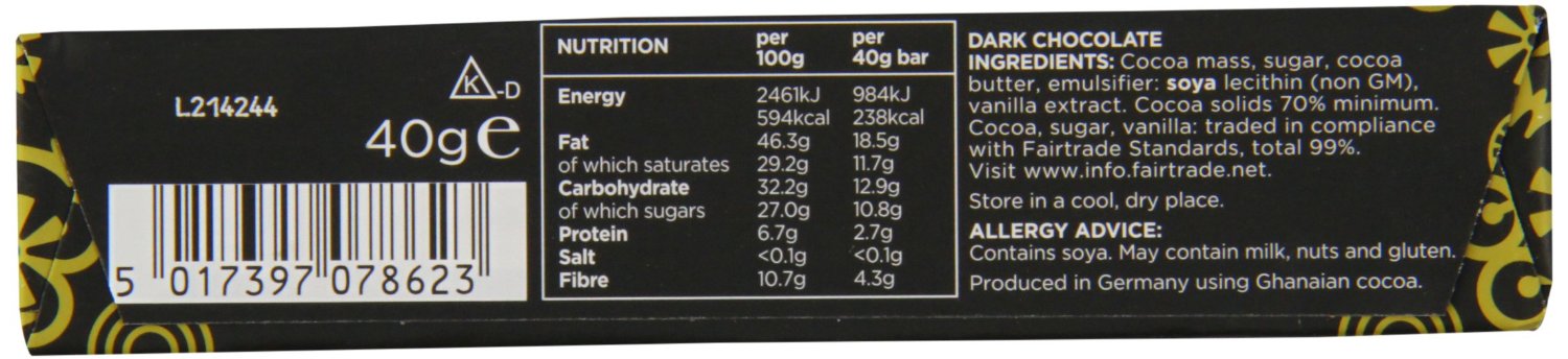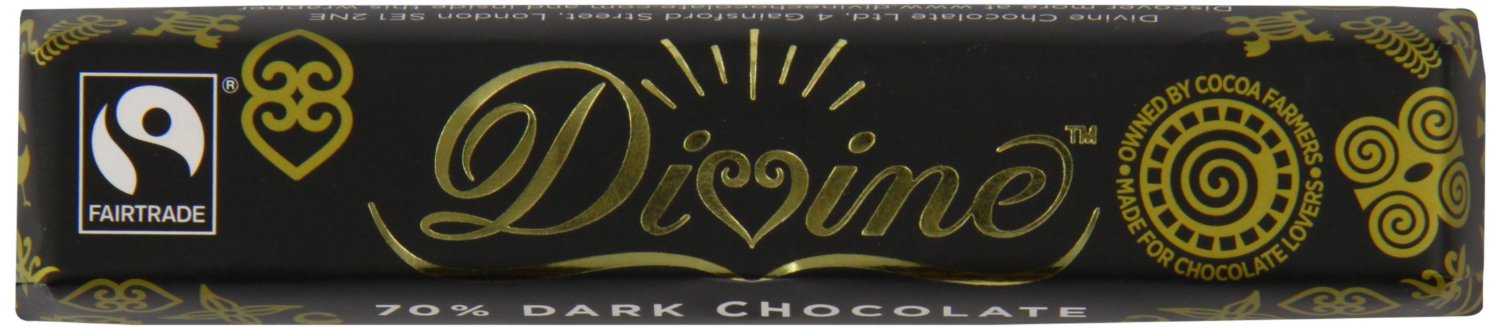 Divine Chocolate 70 percent Dark Chocolate is critically acclaimed, smooth, rich and dark chocolate. It is vegan Society certified; free from artificial flavours, colours and preservatives. It has 100 percent pure cocoa butter, no palm oil or soy, Fairtrade. Made with hand harvested, shade grown, slow fermented cocoa, crafted into timeless recipes to deliver a chocolate experience that is truly divine. It is available 30 bars of each 40 grams.