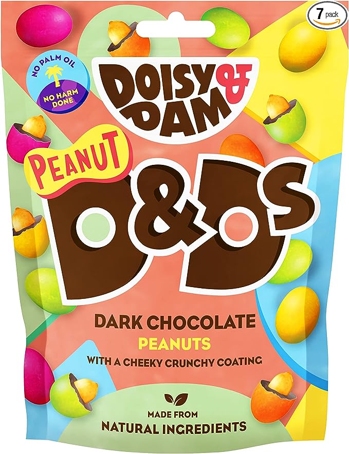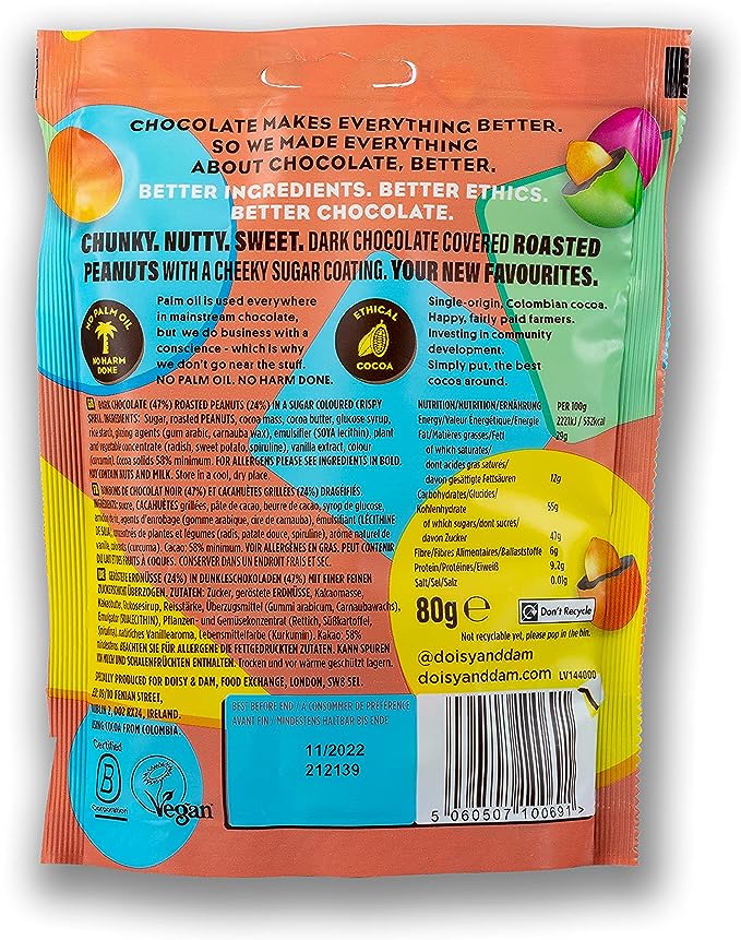 The Doisy & Dam Dark Chocolate Peanut is cheeky, nutty and sweet chocolate that brings you delicious roasted peanuts enrobed in a 58% dark chocolate, all wrapped up in a cheeky sugar shell. Made from ethically sourced Colombian cocoa and no nasties, plus not a drop of palm oil or dairy in sight.