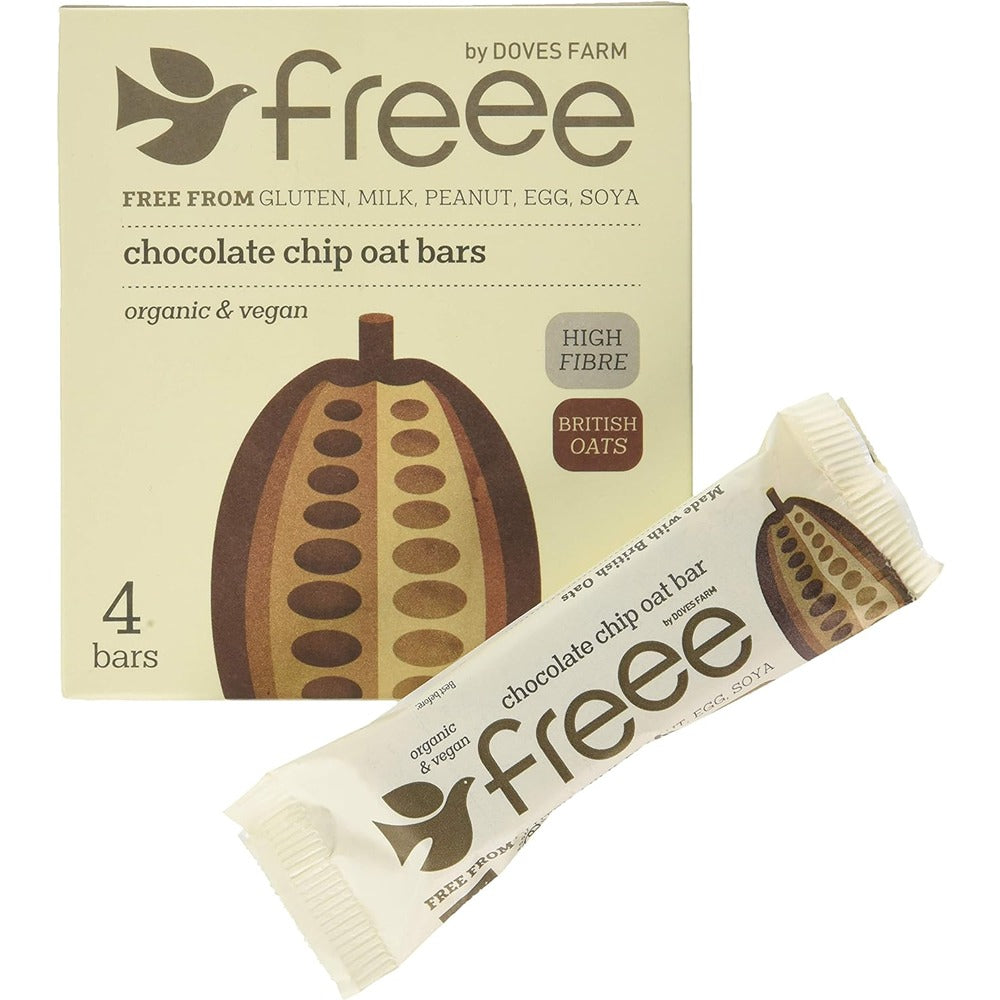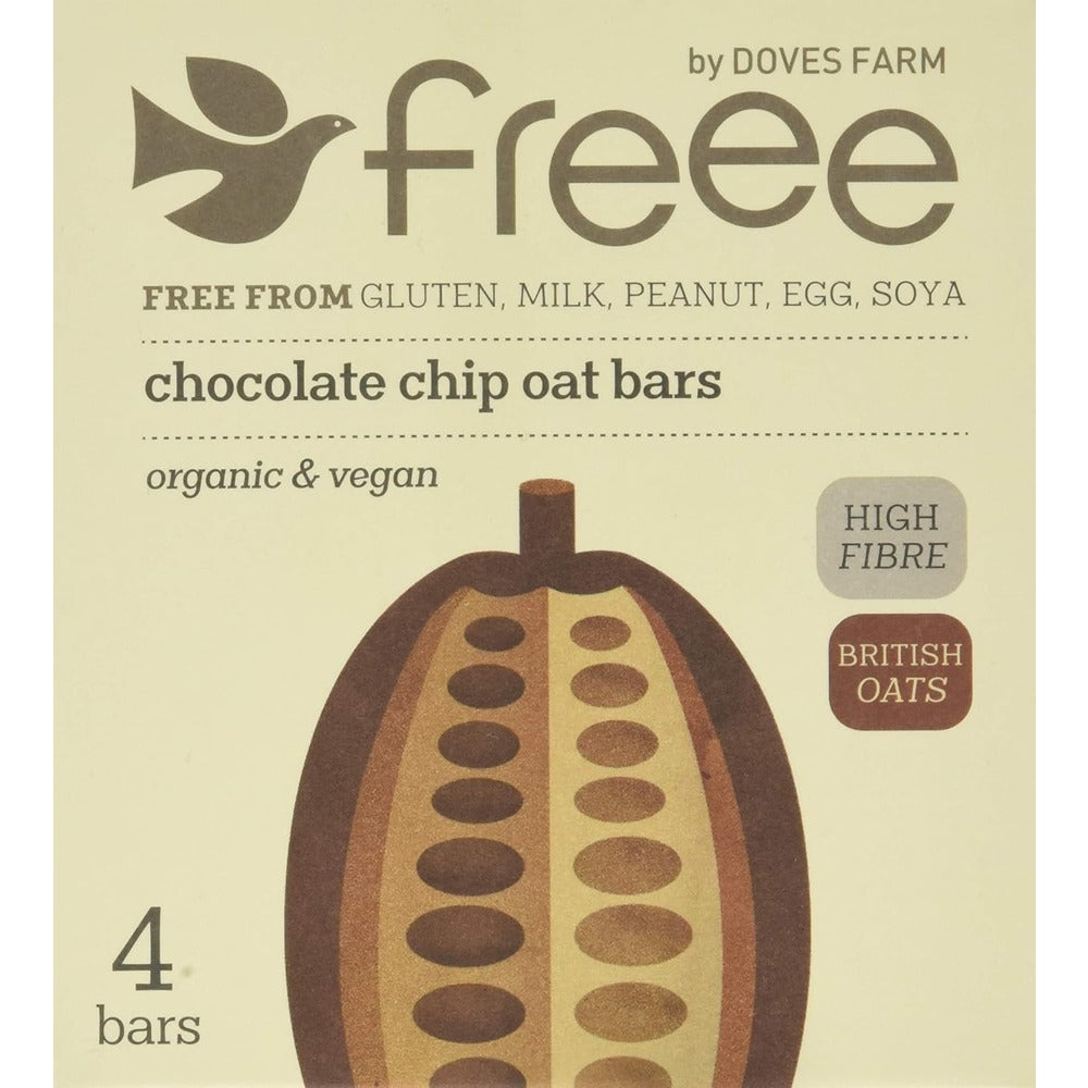 Gluten free, organic chocolate chip oat bars with 70% cocoa chocolate chips. Wholegrain oats and dark, 70% cocoa chocolate chips