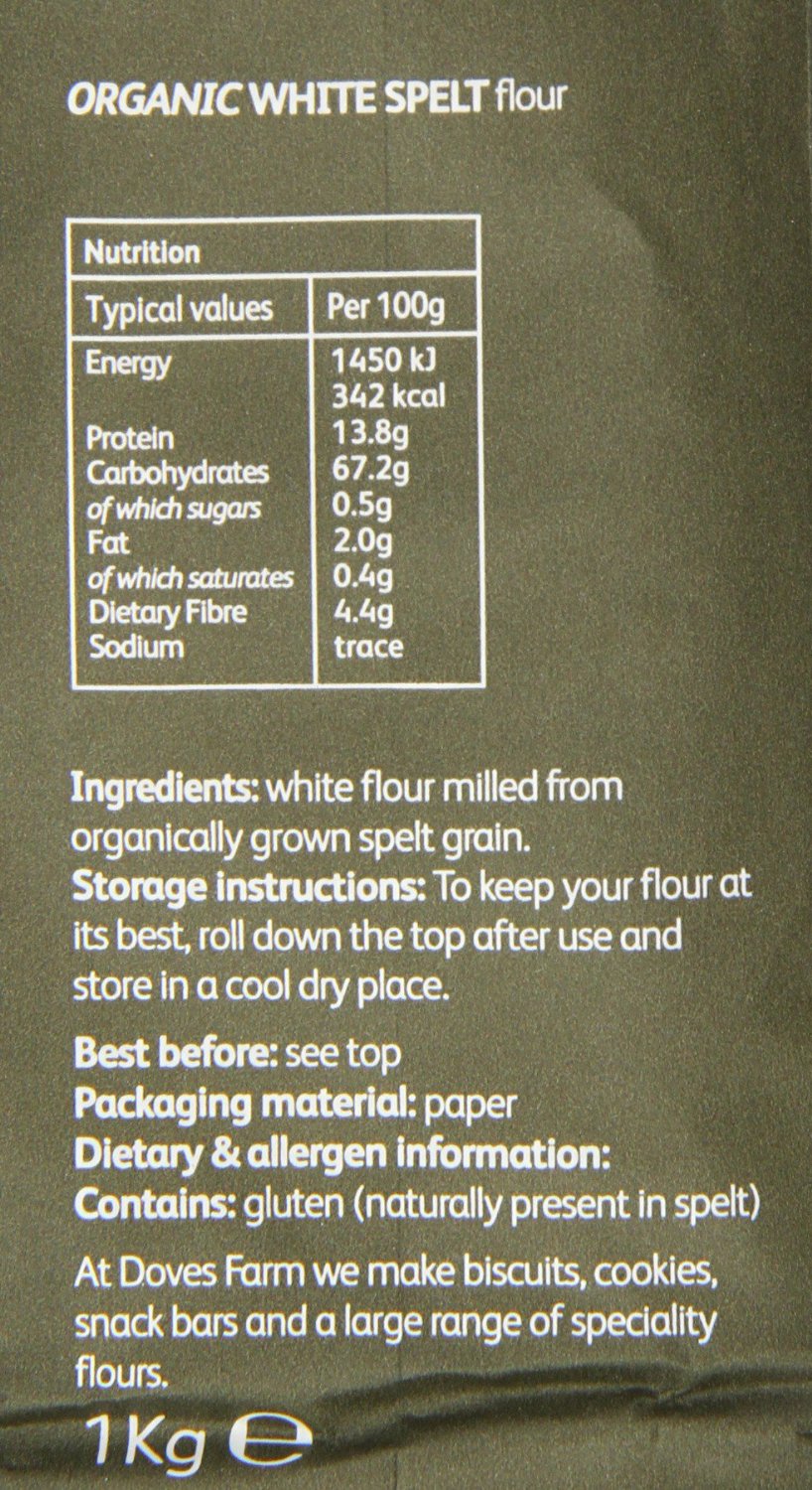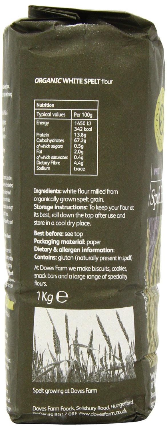 Doves Farm Organic White Spelt Flour has casein free and nut free. Spelt grain, triticum speltum, is mentioned in the Old Testament book of Ezekiel. Hildegard of Bingen praised it in the 12th century and it has once again become popular with chefs and nutritionists. Ideal for the cupboard of all home bakers and will let you bake a variety of different spelt loaves. Also ideal for speciality pastry, yeast cookery and bread making. This flour is Soil Association and Kosher certified. Available 5 packets of 1 kg each.