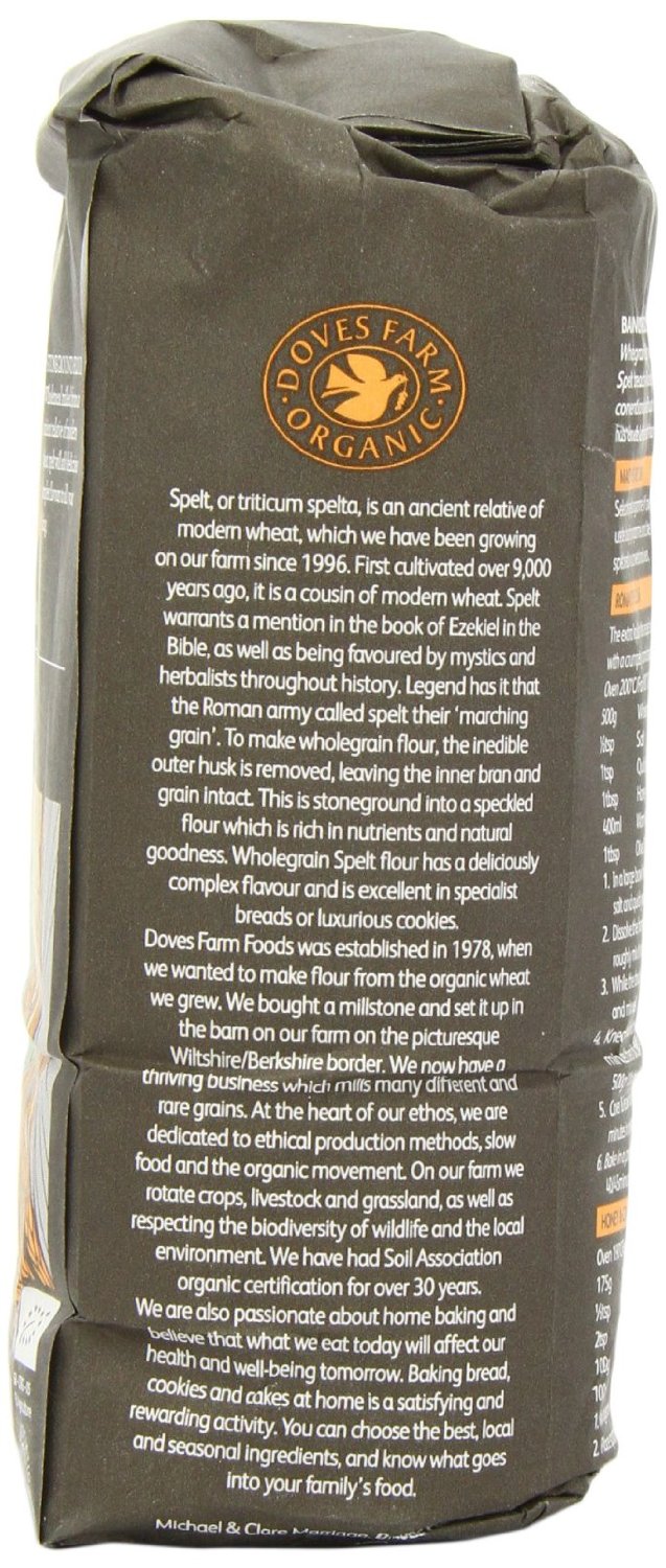 Doves Farm Organic Stoneground Wholemeal Spelt, triticum speltum, was widely grown in Roman times. It is an ancestor of modern wheat and its genetic heritage is a cross of wild grasses and early cultivated cereals. This spelt flour is Soil Association and Kosher certified. It is available 5 packets of 1 kg each.