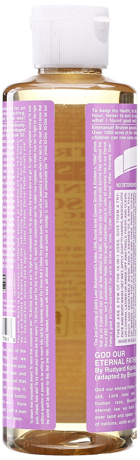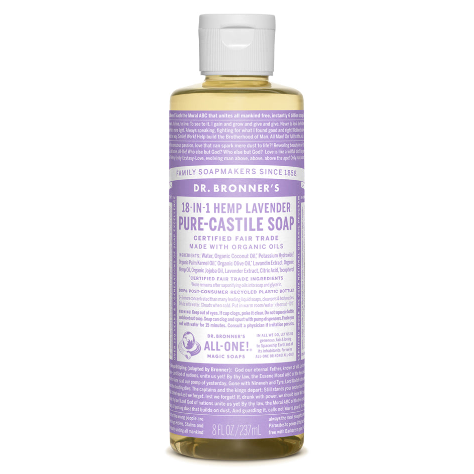 Dr. Bronner's Organic Pure-Castile Liquid Soap is scented with pure lavender and lavandin oils to calm the mind and soothe the body. Lavender Liquid Soap is concentrated, biodegradable, versatile and effective. Made with organic and certified fair trade ingredients. Leaves the skin feeling clean, refreshed, soft and smooth. Available in 237 ml bottle.