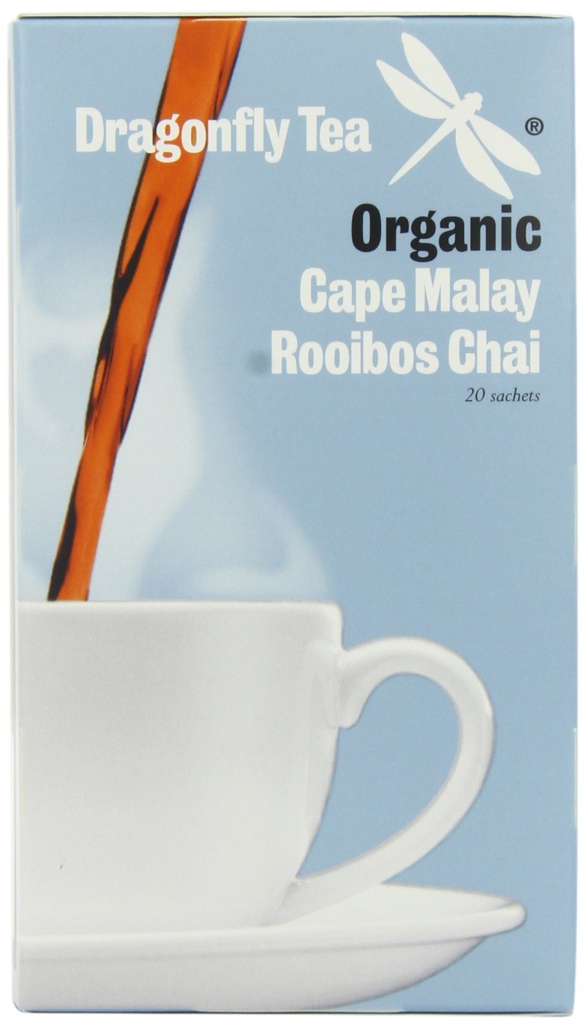 Dragonfly Tea Cape Malay Chai Organic Rooibos is a naturally caffeine free spiced tea perfectly fuses European and Asian influences. It is one of our most popular teas. Warming Cape Malay spices are blended with rooibos tea from Cape Town's Cedarburg Mountains. The rooibos is still cured in the traditional way and requires great skill to harvest well one sign that it is ripe for harvest is the wild honey bees that flock to the bushes. It is available in 20 teabags of 2 g each.